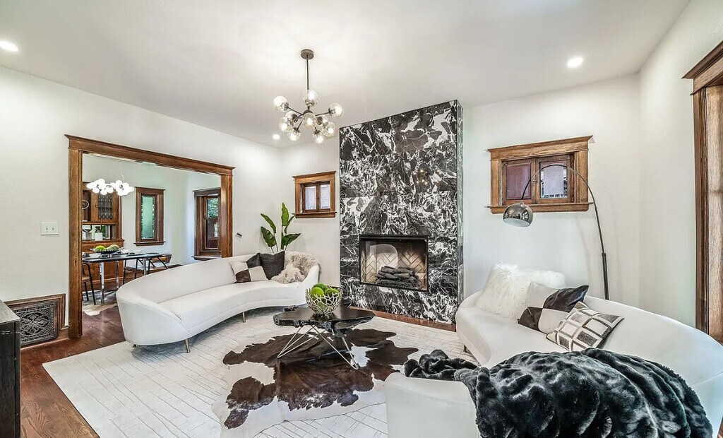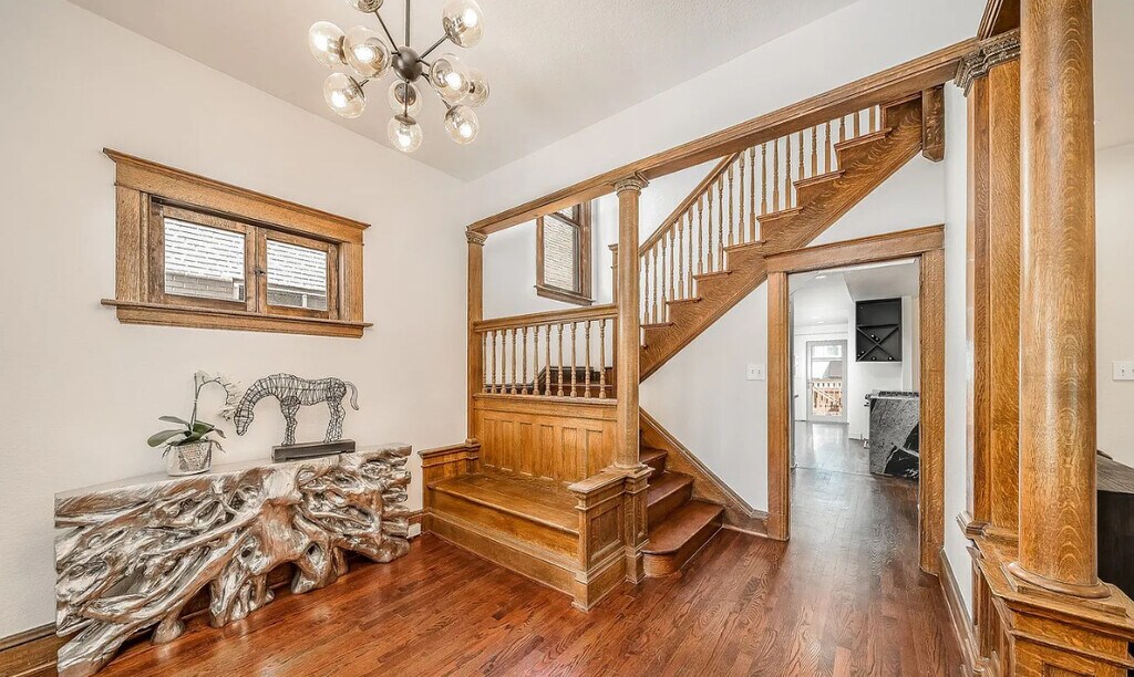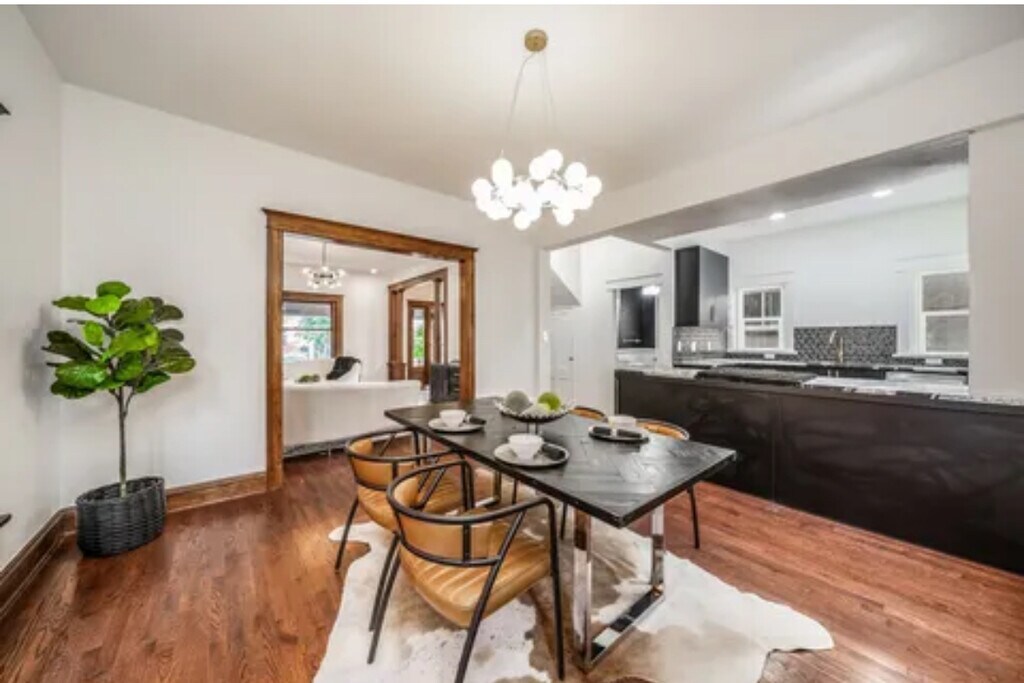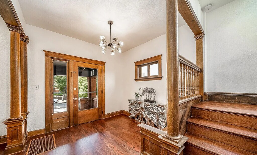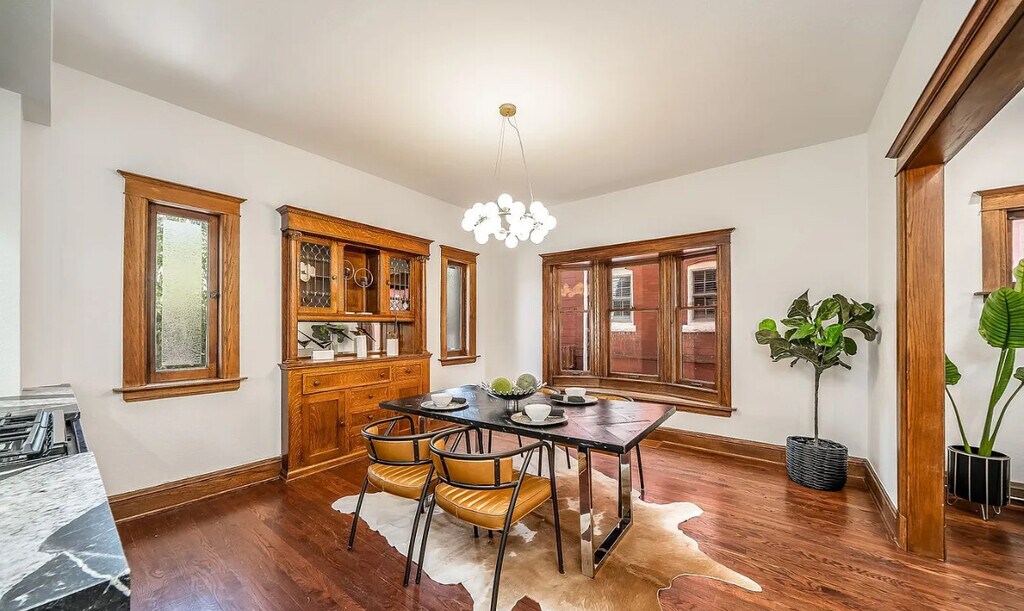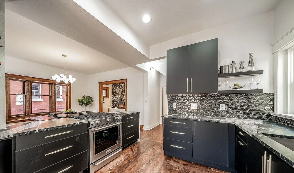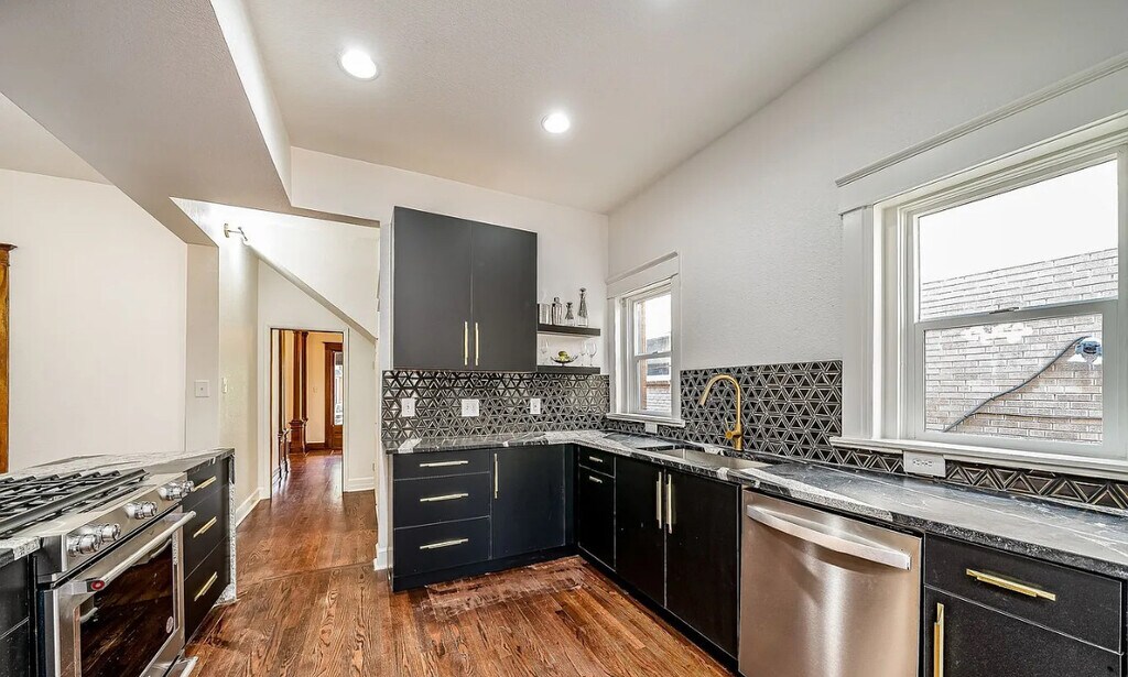 Move in special $3300 for 6 months! Charming renovated Victorian home in Congress Park boasts 6 bedrooms and 3 1/2 baths, enter to your charming home with high ceilings and open floor plan, where old school charm meets modern, beautiful intricate woodwork starting at your entry and stairway carrying through the home to window casings and built in hutch, hardwoods throughout the main level, renovated kitchen with all stainless steel appliances including gas stove, refrigerator and dishwasher, black cabinets and granite counters, powder bath on the main level with your living room perfect for relaxing with decorator white and black modern fireplace wall, dining room with built in hutch and windows with large wood trim, upstairs you will find 4 bedrooms including your spacious primary with ensuite bathroom with full size washer and dryer, off the hallway is another modern full bathroom, bathrooms have been renovated with modern white and black tile and accents, basement has 2 more bedrooms, 1 bath and living area with private entrance and kitchenette with stove top, microwave, dishwasher and washer and dryer, private fenced backyard with patio, 2 car detached garage. Central air. Walkable to Congress and Cheeseman parks, all local shops, dining, entertainment, coffee, and more. Contact Level Up Property Management. Equal Housing Opportunity. Level Up is committed to compliance with all federal, state, and local fair housing laws and will not discriminate against any person because of race, color, religion, national origin, sex, familial status, disability, or any other specific classes protected by applicable laws.