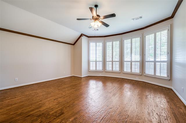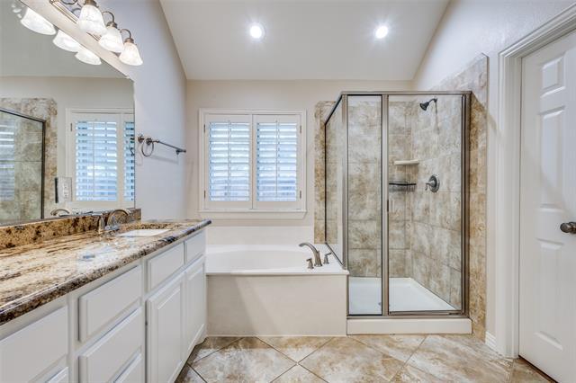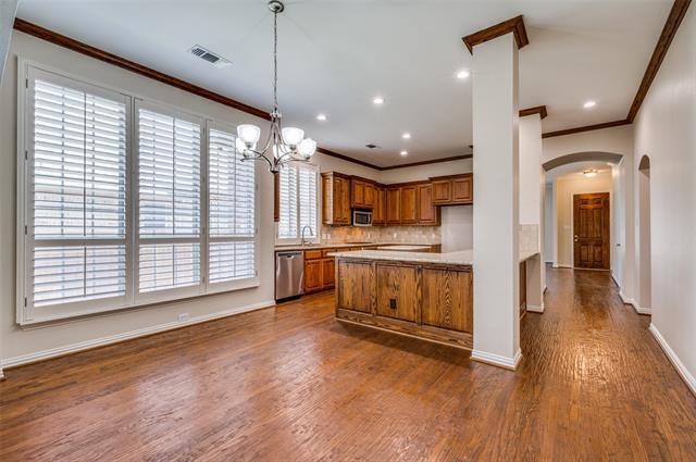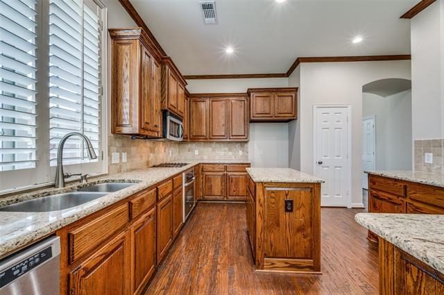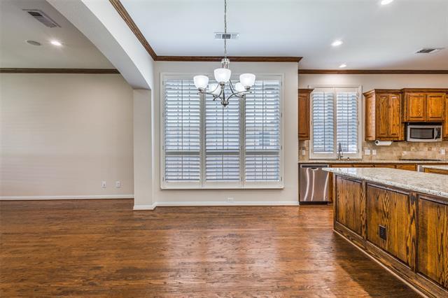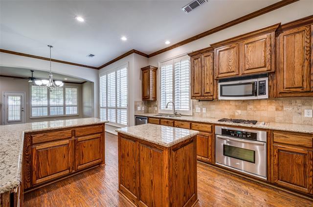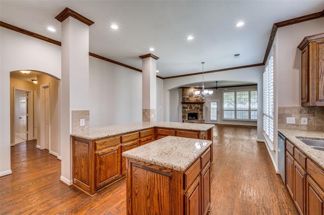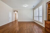 East facing Highland built home in the highly sought after Prosper ISD! Roof and Gutters 2025, Paint 2025, Carpet 2025. This beautifully maintained home offers rich hardwood floors, plantation shutters throughout, and an open layout that’s ideal for both everyday living and entertaining. Inside you are greeted by two flexible spaces, one currently used as a home office with a custom, removable desk, and the other ideal for a formal dining area or second living space. The spacious island kitchen features granite countertops, stainless steel appliances, and plenty of cabinet space. It opens to a bright, airy living room with large windows, a cozy fireplace, and views of the covered patio and private backyard. The primary suite includes a luxurious ensuite bath with dual sinks, a soaking tub, separate shower, and a huge walk-in closet. Secondary bedrooms are generously sized, with walk-in closets and separated from the primary for added privacy. Enjoy all the amenities Lakes of Prosper has to offer, including a clubhouse, scenic walking trails, fishing ponds, and community pools.