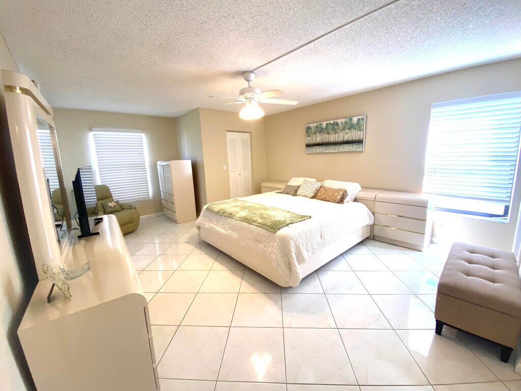 Penthouse 2 bedroom/2 bathroom corner Condo in Huntington Lakes with stunning views and resort-style living!Welcome to this beautifully updated Lancaster model, a spacious 2-bedroom, 2-bath, 1,230 sq ft penthouse corner unit on the 8th floor in Huntington Lakes, an exceptionally active 55+ community in Delray Beach, Florida. The unit is fully furnished and turnkey, so you can just bring your suitcase and settle in. The interior has been freshly painted and is filled with natural light from expansive corner windows. Eastern exposure offers breathtaking sunrises and panoramic lake views from your private lanai, and you can enjoy Florida sunsets from the kitchen window. The condo features an updated eat-in kitchen with stainless steel appliances and a large pantry, along with a full-size