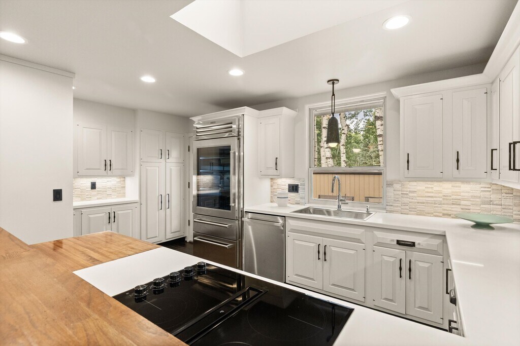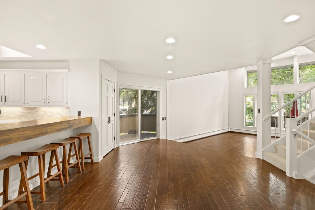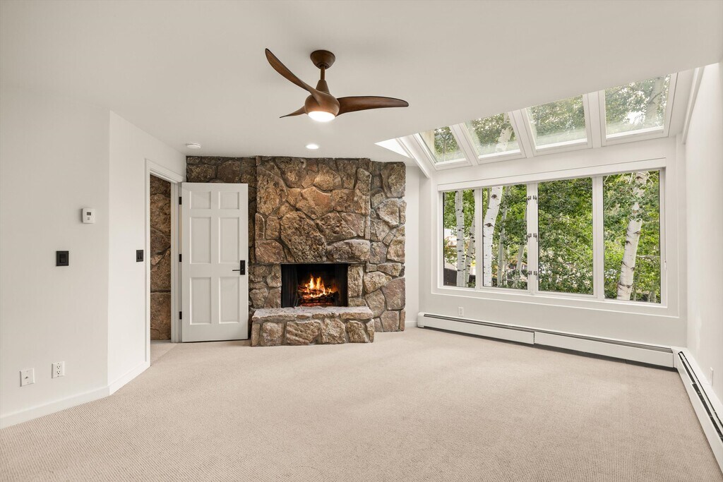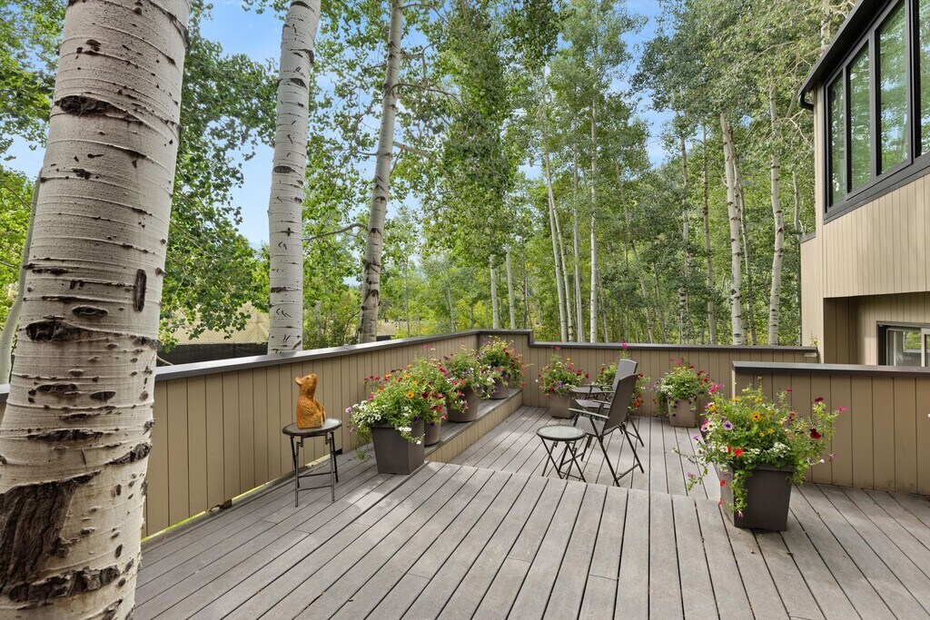 Tucked among the aspen trees in a peaceful, natural setting, this beautifully updated 3-bedroom, 3-bath home offers privacy, space, and comfort just minutes from downtown Aspen. The interior features high ceilings, abundant natural light, and a fresh remodel with contemporary finishes throughout. The living area includes a cozy fireplace—perfect for Aspen's cooler months—while large windows bring the outdoors in.