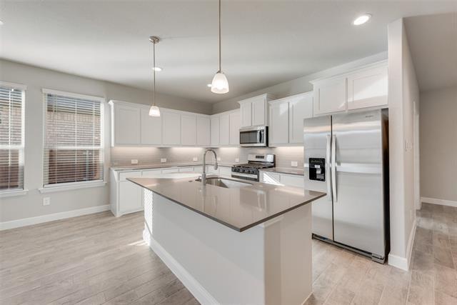 Charming Home in the MASTER PLANNED COMMUNITY of NORTHSTAR in NORTHWEST ISD! Fabulous 4 BEDROOM 3 FULL BATHROOM & a Study. Open Concept Living, Dining and large Chef's Kitchen with Island, Quartz Countertops, tiled Backsplash, Pendant lights, Stainless Steel Appliances, gas Range and walk-in Pantry. Spacious Living and large primary Bedroom with two sink Quartz top vanity, large walk-in Shower, linen and walk-in Closet with built-ins. Designer Pkg including extended tiled Entry, Halls, and wet areas. Quartz topped Bath Vanities, plus Home is Connected Smart Home Technology. Front exterior Coach Lights, covered back Patio, 6 foot fenced backyard. Refrigerator included! Amenities to include: Amenity Center, Game Rooms, Event Space, Splash Pad, Pools, Playground and Soccer Field.