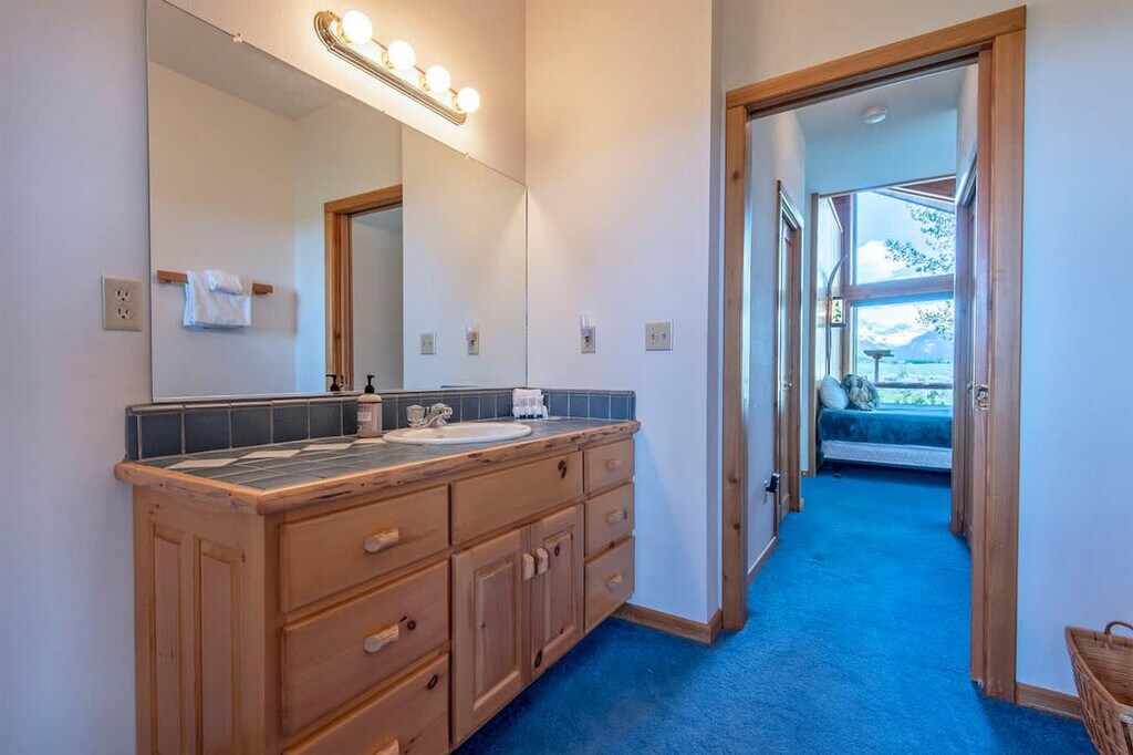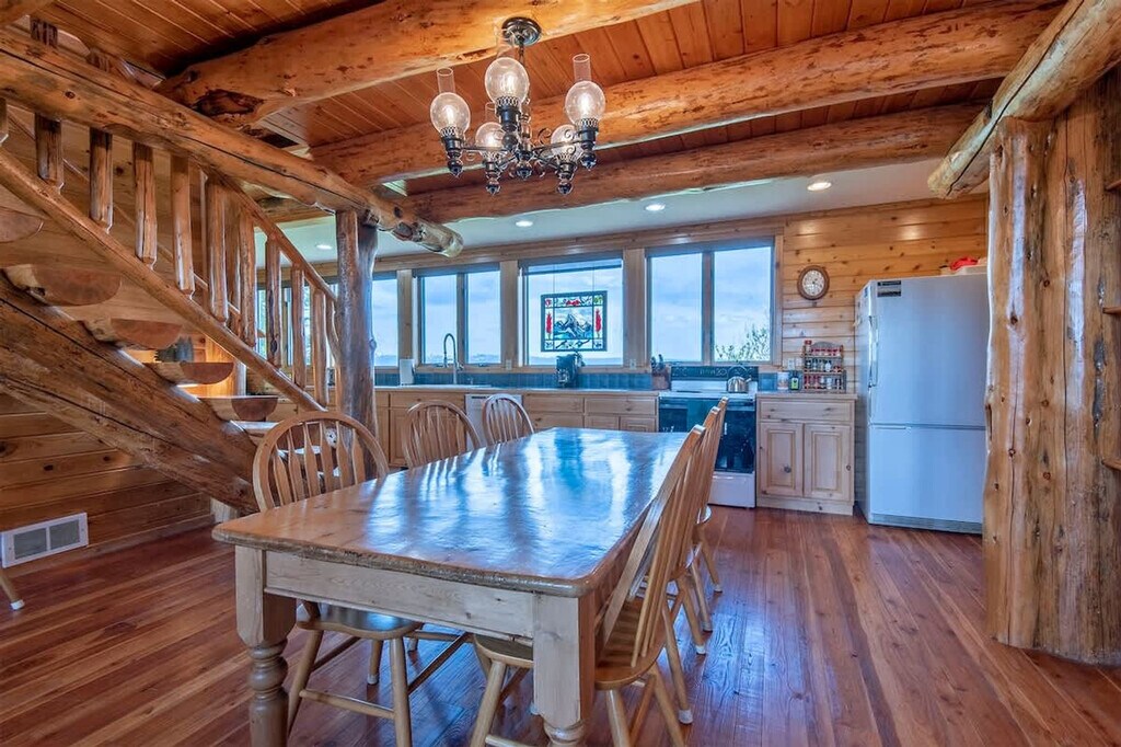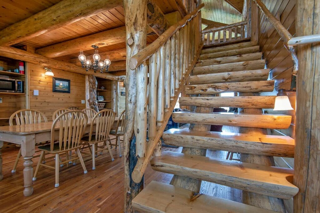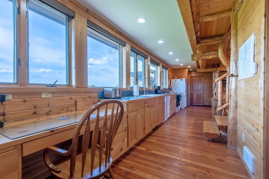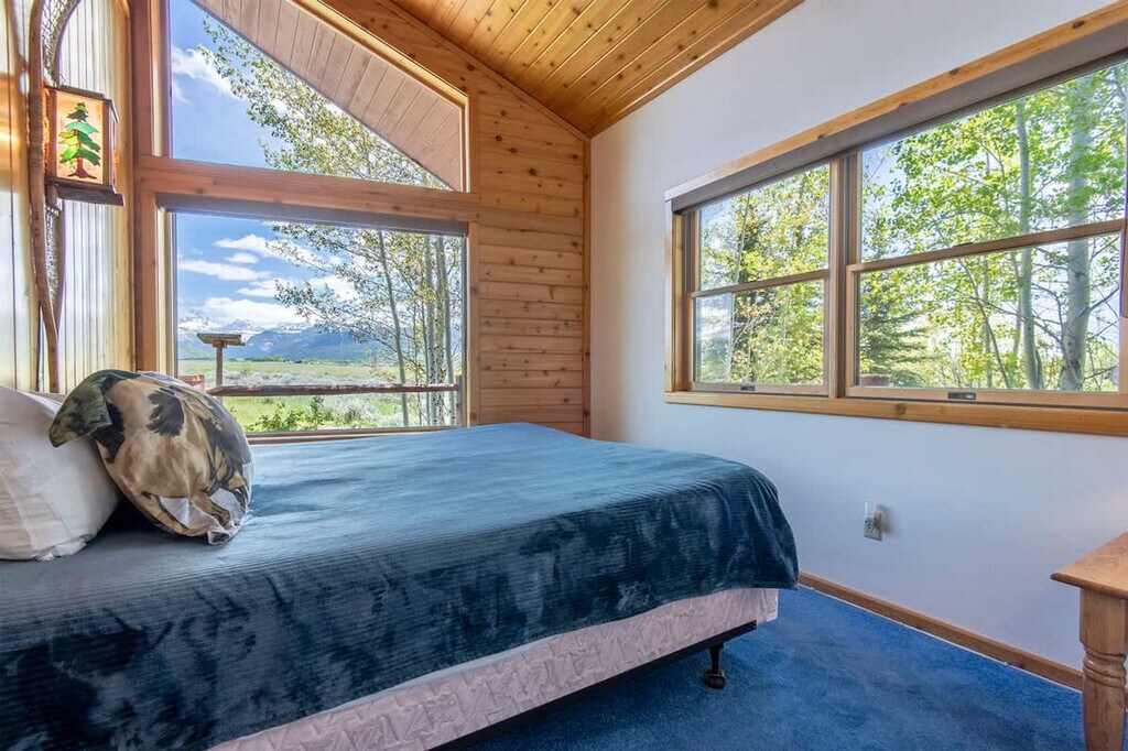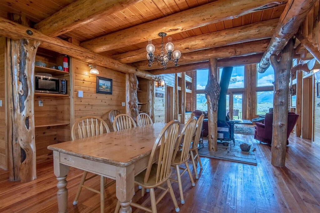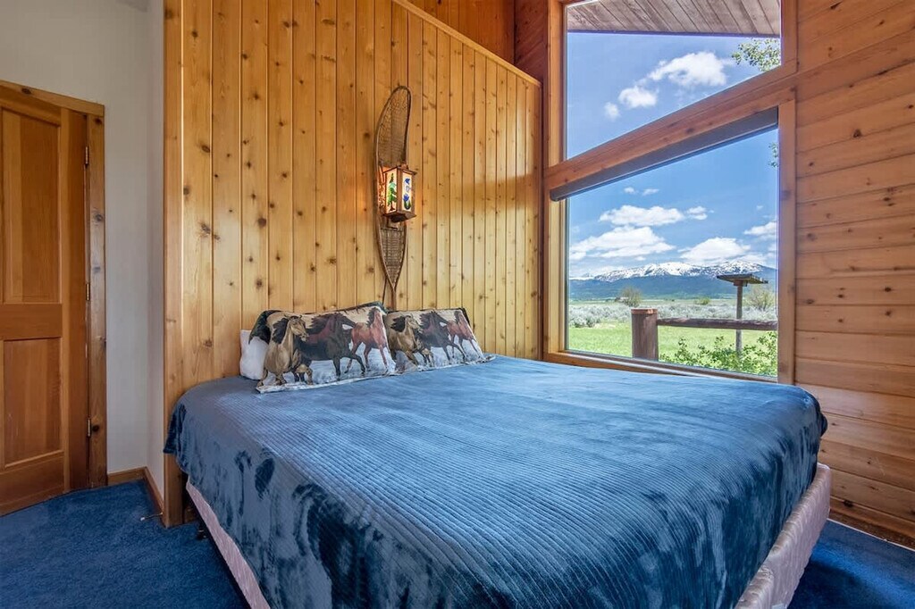 This 2600 sq ft log cabin offers an awe-inspiring, quiet mountain getaway for up to 10 guests. Large east-facing picture windows provide breathtaking views of the magical Teton range. The expansive kitchen spans the entire west wall, offering a spectacular view of the Big Hole mountains. With vaulted ceilings in the living room and a 3/4 wraparound loft, this house provides comfort and views in every direction. A wraparound and partially covered deck facing south and east allows for year-round outdoor enjoyment. The cabin features two bedrooms on the lower level, each with full baths accessible through the bedrooms or kitchen. The loft includes a central common area with a queen futon. To the north and south of the central loft, there are spacious alcove bedrooms with privacy partitions that overlook the cabin. The cabin is conveniently located with access to hiking and activities in the Tetons, affectionately known as the quiet side of the Tetons. It is 1 hour and 3 minutes (43.4 miles) from Grand Teton, 1 hour and 56 minutes (101.7 miles) from Yellowstone's West Entrance, and 2 hours and 28 minutes (106.3 miles) from Yellowstone's South Entrance. Grand Targhee Ski & Summer Resort is 21 minutes (11.0 miles) away, and Jackson Hole Mountain Resort is 55 minutes (39.7 miles) away. The cabin is also close to regional airports, with Idaho Falls, ID (IDA) 1 hour and 13 minutes (72.7 miles) away, Jackson, WY (JAC) 1 hour and 9 minutes (47.8 miles) away, and Bozeman, MT (BZN) 3 hours and 20 minutes (183.1 miles) away. Nearby towns include Driggs, ID (10 minutes, 5.7 miles), Victor, ID (21 minutes, 14.1 miles), Jackson, WY (56 minutes, 38.5 miles), and Teton Village, WY (56 minutes, 39.8 miles). Guests are expected to treat the home as their own and respect the rules, neighbors, and local community. The number of people should not exceed the maximum sleeping capacity. Quiet hours are from 9 pm to 8 am. No events, parties, or large gatherings are allowed. Smoking or vaping in the home or on the decks is prohibited, and an additional charge will be applied if any butts are found on the property. Exterior lights should be turned off at night to preserve the dark skies. A maximum of four licensed vehicles is allowed in the driveway and garages. Snow machines, dirt bikes, and ATVs are not permitted in the subdivision or at the rental property. Candles or incense should not be burned in the home. Fireworks are not allowed on the premises. All main entry doors should be locked when not occupied. A maximum of two pets is allowed, and guests must inform upon booking if bringing pets. Pets are not allowed on furniture or bedding, and pet owners should provide their own pet bedding. An additional fee may apply if pet hair is found on furniture or bedding. Owners must pick up after their pets, and pets should not be left unattended unless kenneled or crated. Noise complaints from kenneled pets may result in the termination of the stay. Fines will apply for violations, including leaving garbage in the house or litter on the grounds, failure to disclose or clean up after pets, smoking in the house or garage, failure to follow house rules and respect posted signs, failure to follow check-out procedures, mistreatment of the hot tub, or violations of local laws. A minimum $500 fine will be imposed for smoking, vaping, or using marijuana in the house or garage, violating house rules, posted signs, laws, or failing to vacate at check-out time. [SI]