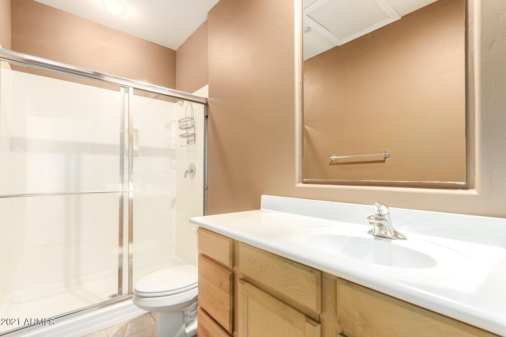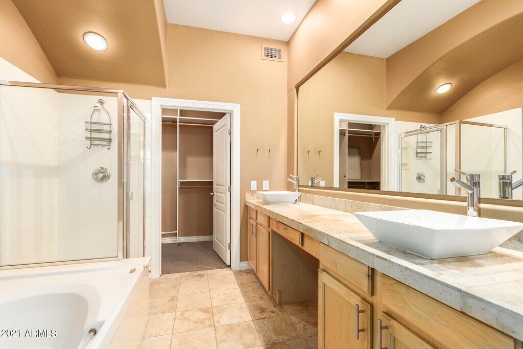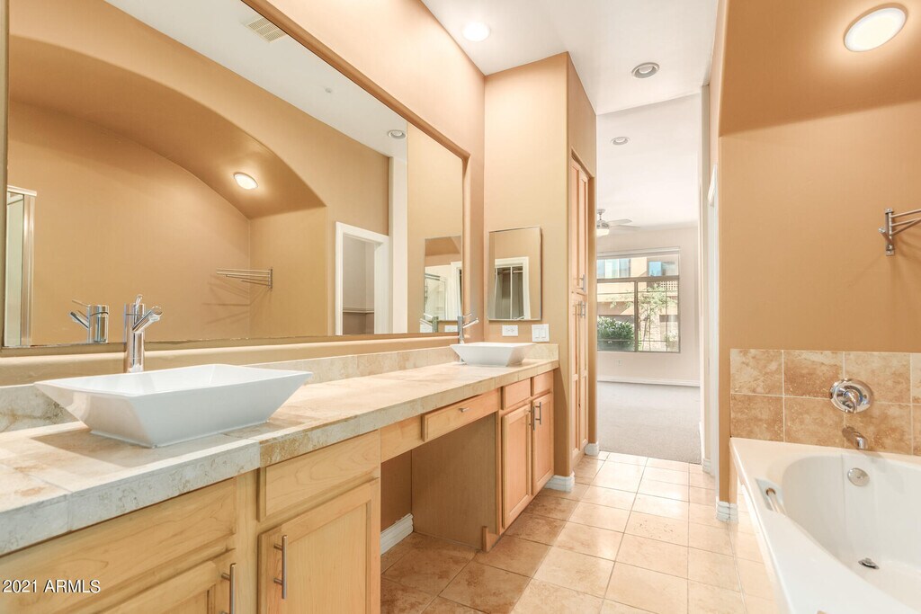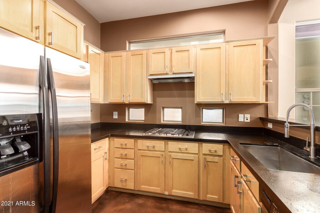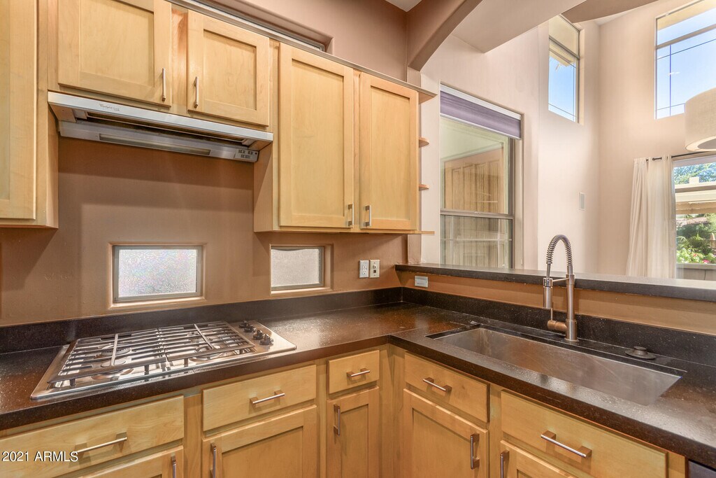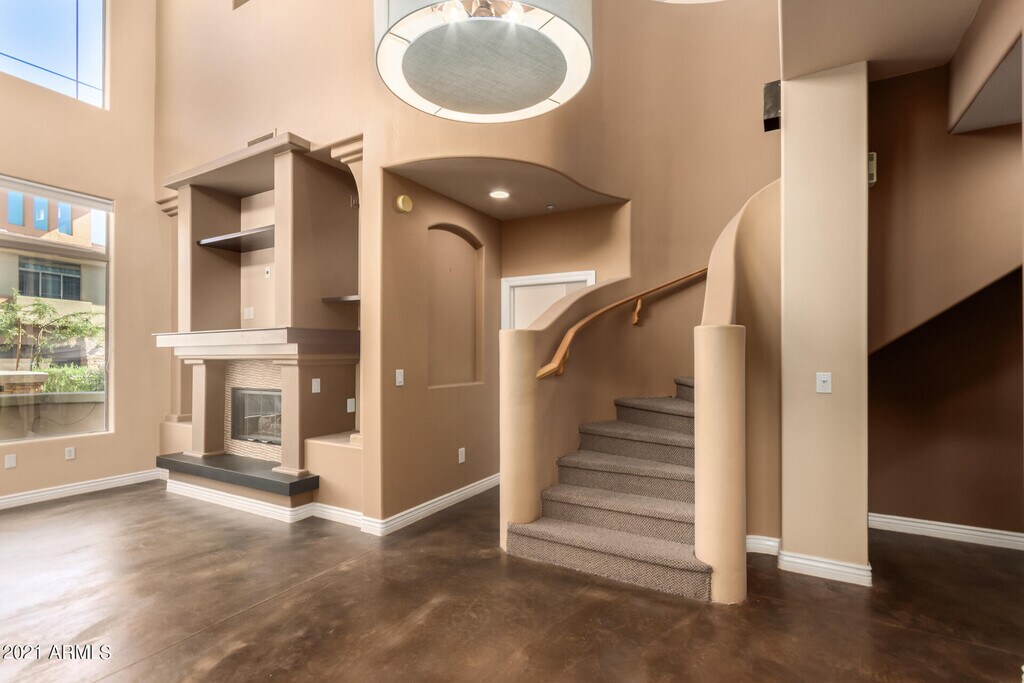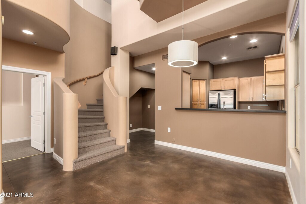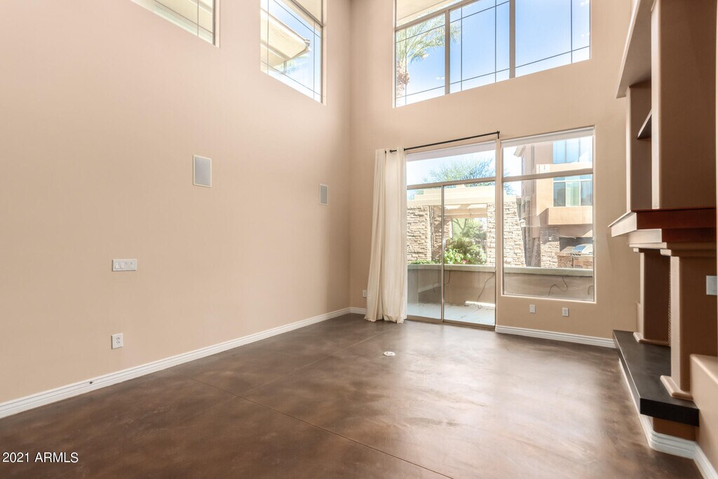 Contemporary remodeled two story unit in a quiet gated community in North Scottsdale. 2 BR 2.5 Bath with 26' ceilings. Acid stained concrete floors,new paint,travertine master with vessel sinks,stainless steel appliances and Indian Leather granite countertops in the kitchen,double wall ovens,and gas cooktop. Washer and dryer inside. Attached two-stall garage. 2nd story balcony with mountain views. Heated community pool and spa. Easy access to the 101. Shopping within walking distance. Excellent location!