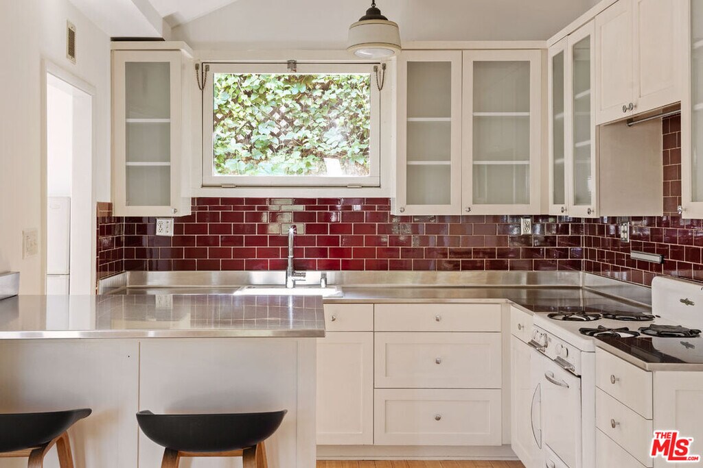 Available for lease in Silver Lake, this gated 1923 California bungalow enjoys a quiet leafy cul-de-sac setting, just a short distance from the Silver Lake Reservoir. A front porch welcomes you into a bright living space where sliding doors connect to a brick patio for dining alfresco. The open kitchen provides generous counter space, O'Keefe and Merritt range, white cabinetry, and room to gather. Both bedrooms are well-proportioned, and there is a full bath with vintage tile and a clawfoot tub. Serene outdoor areas include a backyard with a decorative fireplace and shaded spots to relax under a canopy of trees, including a loquat and a Seville orange. Amenities include AC, laundry, and a one-car garage with tandem parking. You are close to Bacari Silver Lake, Picnic Coffee, Malaya Coffee, and many more neighborhood favorites. MLS# 26693355