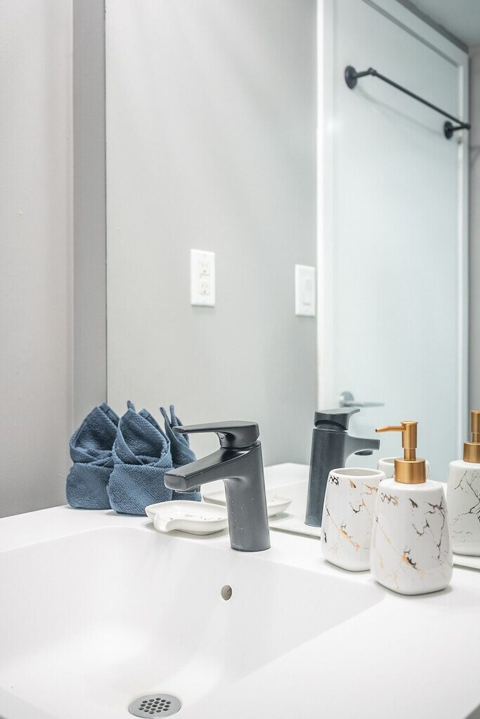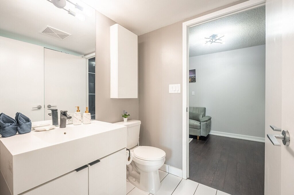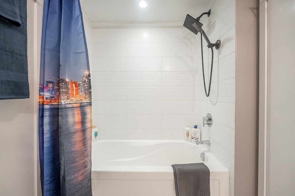 Feel right at home in this comfortable suite that has everything you need. It's conveniently located with easy access to the TTC, Union Station, Lake Shore, and Gardiner Expressway. This suite features a fully functional kitchen with tea, coffee, a kettle, coffeemaker, and toaster. It also includes a washer and dryer. The bathroom is equipped with towels, shampoo, conditioner, body wash, a hair dryer, and other toiletries. Paid underground parking with in/out privileges is available upon request for $20 per night, or $10 per night if you book for at least 15 nights. A travel crib (for babies 0-18 months) and bed rails are available for $5 per item per night. Pets are allowed with a fee of $10 per night per pet; please confirm with us prior to booking. You'll be steps away from the CN Tower, Rogers Centre, Union Metro Station, Financial District, bars, restaurants, Sobeys Grocery Store, and Bishop Airport. Every guest must provide their personal information prior to check-in. Guests whose names or IDs do not match the provided information are not allowed into the building. Guests need to be 18 or over in order to check in. [SI]