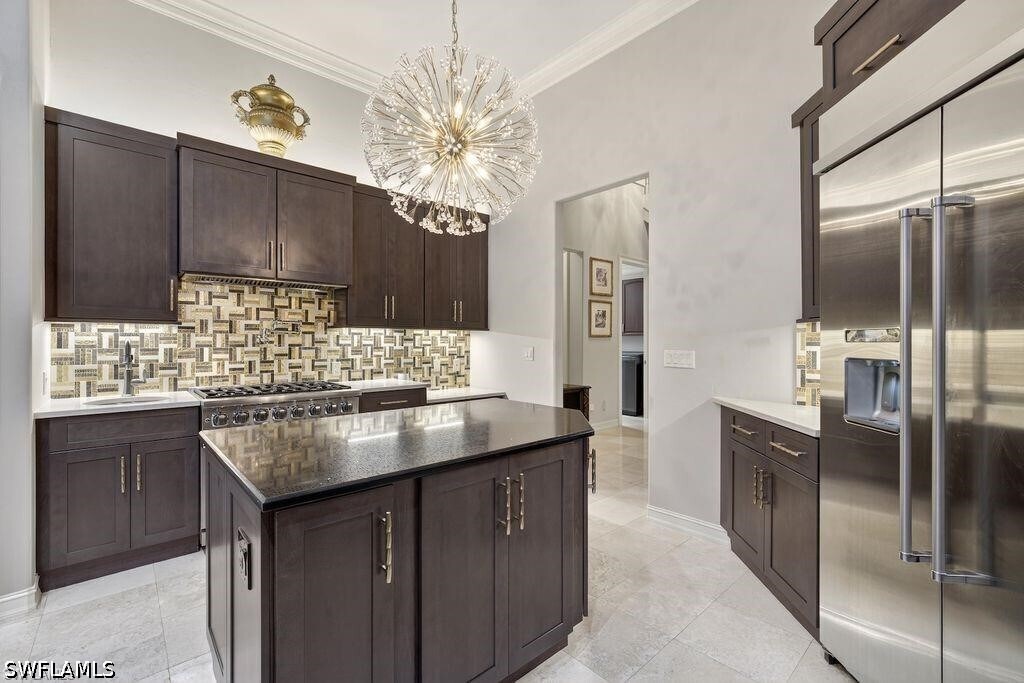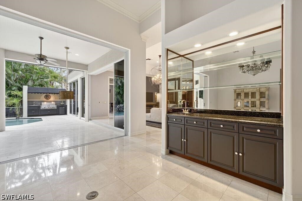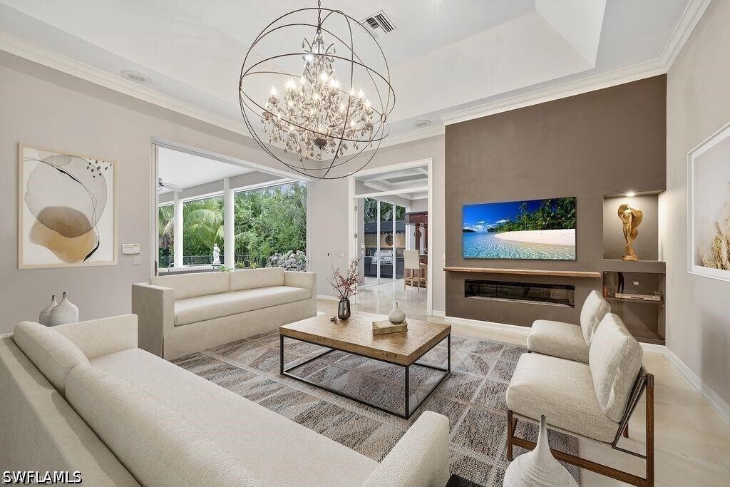Experience luxury rental living in this exquisite estate home on an oversized corner homesite in Edgewater,the premier neighborhood of Gulf Harbour Yacht & Country Club. Designed for both elegant entertaining and everyday comfort,this exceptional residence offers 4,922 square feet of beautifully appointed living space. The thoughtfully designed floor plan features three en suite bedrooms,a private office/den,sauna,media room with a built in bar,and a versatile bonus room that can be used as a fourth bedroom,game room,or wellness retreat. A private balcony overlooks the stunning pool and lanai,creating a peaceful retreat. Travertine marble flooring flows throughout the home,while two fireplaces and soaring lighted volume ceilings with extensive crown molding create a bright and sophisticated atmosphere. The updated custom kitchen is a chef’s dream with a gas Viking range,rich wood cabinetry,quartz countertops,an oversized island with breakfast bar,and a butler’s pantry,all opening seamlessly to the family room and formal dining area for effortless entertaining. The main level primary suite offers privacy and comfort with a spa inspired bath featuring a Jacuzzi jetted tub and two walk in closets with closet organizers. Two walls of sliding glass doors open to a private outdoor oasis. The expansive lanai includes a custom pool with waterfall and spa,covered seating areas,a fully equipped outdoor kitchen with grill,refrigerator,and sink,plus a convenient pool bath. Additional features include an oversized 3 car garage,newer roof,resurfaced pool,and fresh interior and exterior paint. This is a rare opportunity to lease a truly exceptional home in one of Fort Myers most sought after communities.