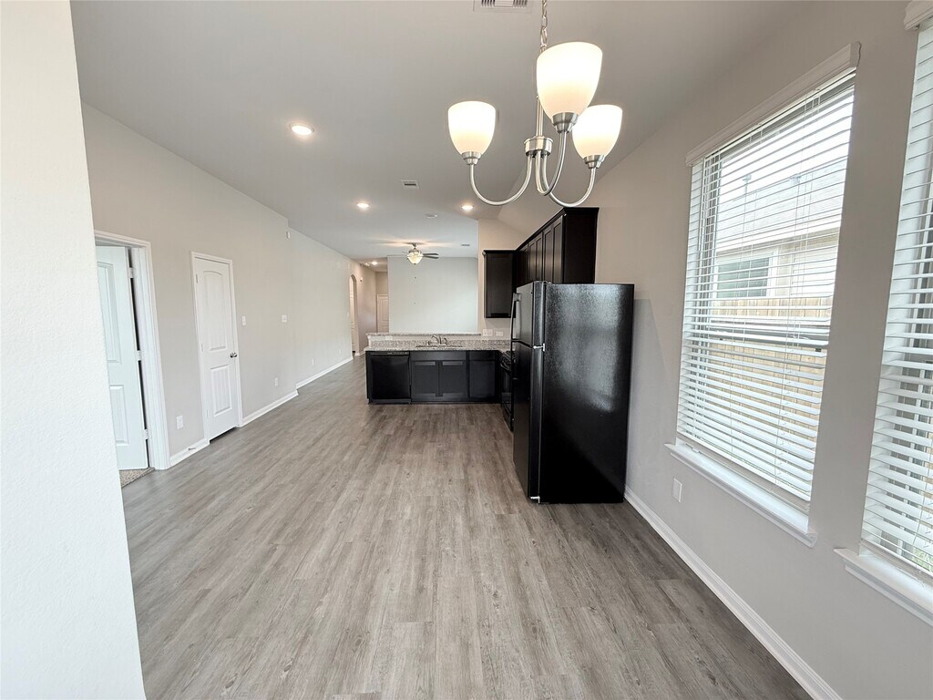 Beautiful and move-in ready! This 4-bedroom,2-bath home in Granger Pines features a smart split floor plan with the private primary suite tucked at the back. Enjoy wood-look laminate flooring in the main living areas,cozy carpet in the bedrooms,and a stylish kitchen with black appliances,matching black cabinets,and a refrigerator included. The spacious primary suite offers a tray ceiling,walk-in closet,dual sinks,soaking tub,and separate shower. Fully fenced backyard with just enough space to relax or entertain. Located just minutes from Hwy 242 with quick access to shopping,dining,and more! MLS# 5772240