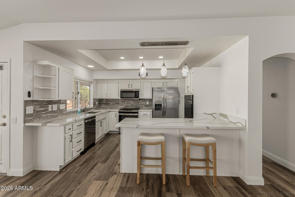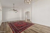 Charming 2-bedroom home in the 55+ Sun City West! Displaying a desert landscape,paver-front patio,& a 2-car garage w/cabinetry. The inviting interior features vaulted ceilings,tons of natural light,neutral palette,and wood-look tile flooring t/out. You'll love the formal living & dining room and large separate family room. The spotless kitchen boasts SS appliances,quartz counters,tile backsplash,ample white cabinets,recessed/pendant lights,a walk-in pantry,and a breakfast bar. Double-door den w/built-in desk! Double-door main bedroom has a bay window w/plantation shutters and an ensuite w/dual sinks,bidet,& a walk-in closet. Secondary bedroom offers outdoor access. Laundry room w/sink & cabinets. Outback,you have an extended covered patio to relax or enjoy BBQ. Move-in ready!