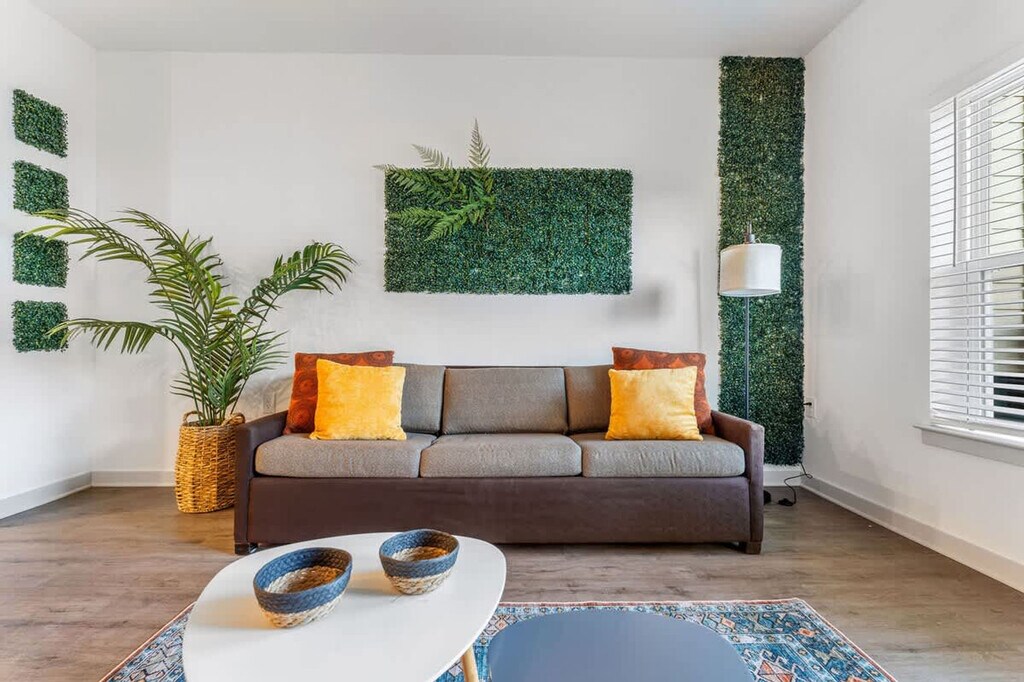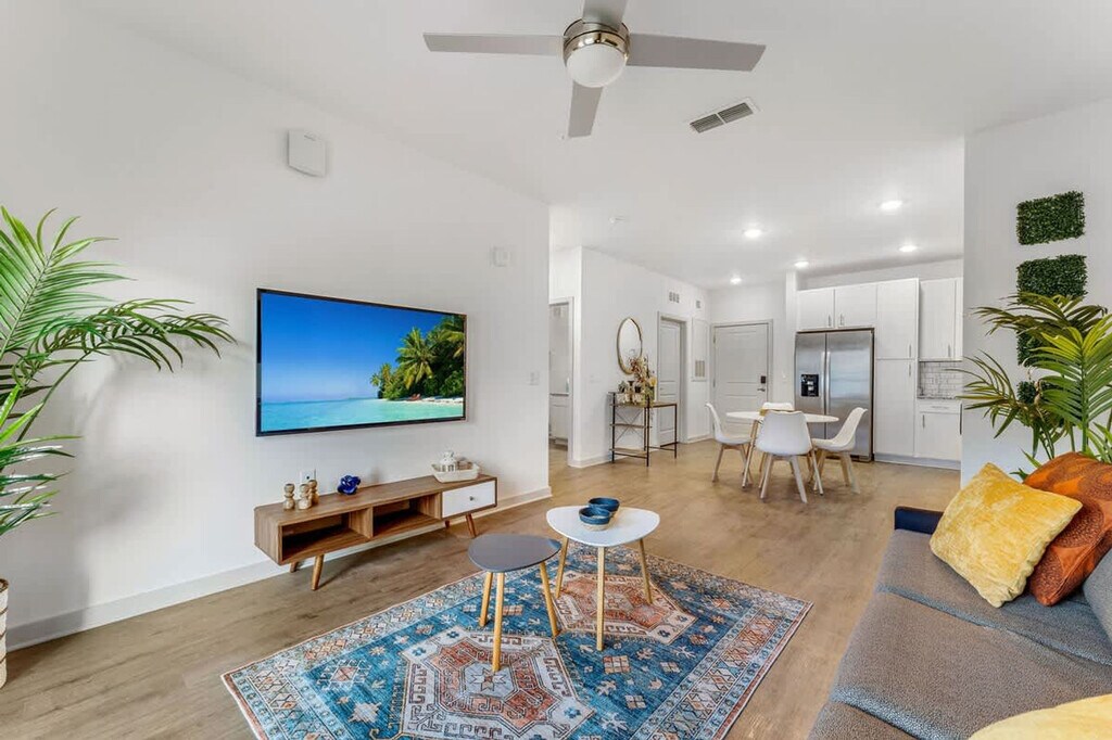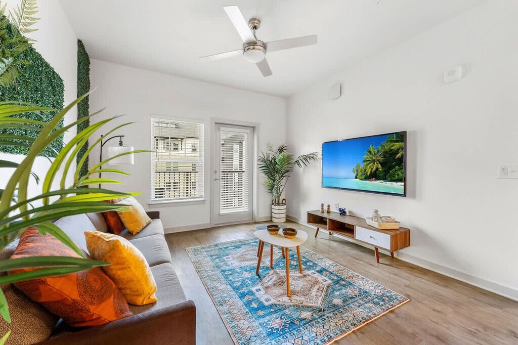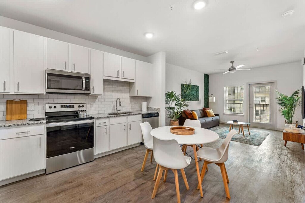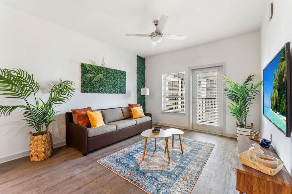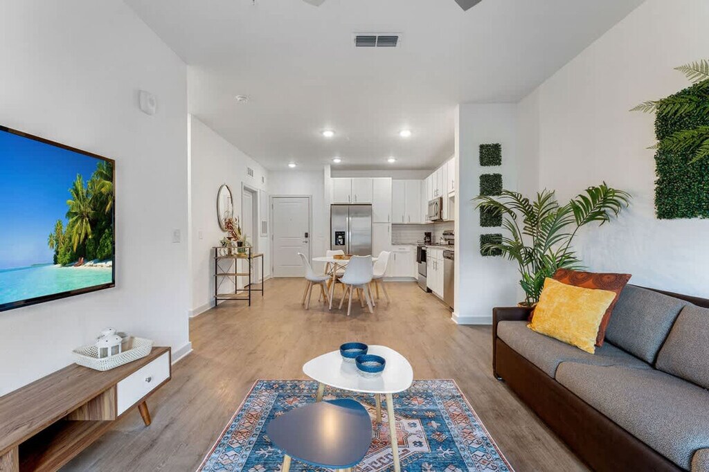 Feel at home in this perfectly located apartment in Bay Lake, just 10 minutes from Disney World. This property sleeps four people and offers a peaceful retreat with all the comforts of home. The apartment features a fully equipped kitchen with a stove, microwave, refrigerator, coffee maker, dishwasher, full set of cookware and utensils. For your convenience, there is also an in-unit washer and dryer. Enjoy a relaxing space to unwind after your adventures with a 55” smart TV in the living room and a 43” smart TV in the bedroom. The apartment also features a private balcony with a seated area. Three free parking spots are available on-premise. An EV paid charger is present on location, but availability or available space cannot be guaranteed. Nestled in the heart of Bay Lake, this charming property offers the perfect home base for an unforgettable Orlando vacation. Located just minutes away from world-famous theme parks, delicious dining options, and a variety of recreational activities, you'll have everything you need to create cherished memories. Universal Studios/Island of Adventure and SeaWorld are also easily accessible. The apartment is a short drive to the Tibet-Butler Nature Preserve and Bay Lake. There are many different culinary options as well as stores of every kind ranging from Target, Ross, and Publix supermarket within walking distance. Quiet hours are between 10 PM and 8 AM. To enhance neighborhood safety, the building management kindly asks all guests staying at the property to provide their full name, surname, and date of birth during the reservation process. Pets are welcome, but some breed restrictions apply. [SI]