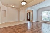 Spacious single story home on over-sized corner lot. Elegant entryway! Formal living and dining with "wood" tile floors. Formal living could be an office. Arches lead you to the main living areas. LARGE kitchen with 42'' cabinets,silestone counters and eat in breakfast area. Kitchen is open to the family room. High ceilings throughout. Family room with high ceilings and gas log fireplace. Primary bedroom w/2 closets. Study area off primary could be perfect nursery! Covered back patio! Walk behind the house and you're at the lake and trails! Very elegant and ready for immediate move in. MLS# 48836469