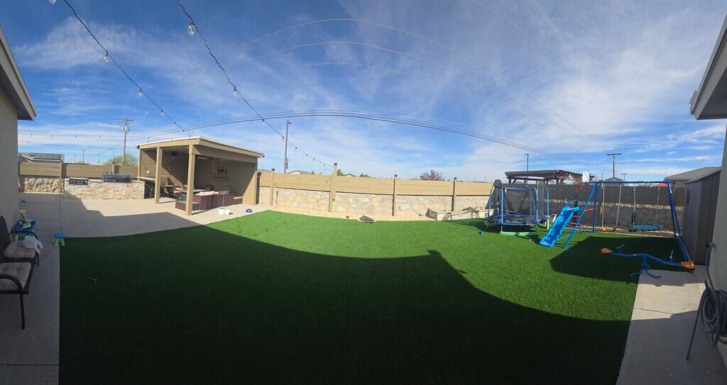 Modern 3BR Horizon City Gem with Ultimate Backyard Retreat & Solar Savings?Experience luxury living in this stunning 3-bedroom, 2-bathroom single-family home, designed for those who love to host. The heart of the home is a spacious living area featuring a massive built-in entertainment center, perfect for movie nights. The kitchen comes fully equipped with a gas range, microwave, refrigerator, and dishwasher.?The true "wow" factor awaits outside. Your private, fully fenced backyard is a desert oasis featuring:?A custom pergola with integrated electricity.?A sleek outdoor kitchen for summer BBQs.?A large, lush artificial grass area for year-round greenery without the maintenance.?Bonus Perks:?Low Utility Bills: Equipped with solar panels to keep your electricity costs at a minimum. Summer bills as low as *$50?Convenience: Includes washer/dryer, a 2-car garage, and is steps away from local schools and parks.Located near I10 and Eastlake shopping centersSchedule a viewing to see how this Horizon City 3 bed/2 bath home can be your next address. Preferably not a pet friendly home but could be discussed with landlord.*this amount could change or vary depending on the usage per month