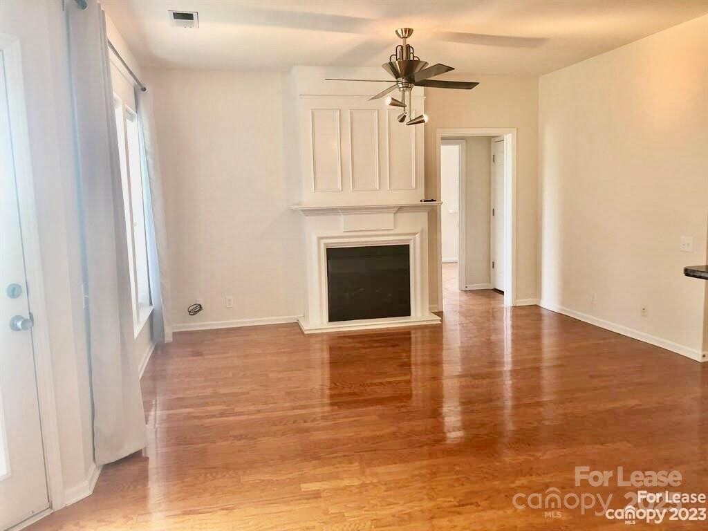 2 bed room 2 full bath with office on 4th floor,end unit in gated community behind Ballantyne Village. Unite has nice open and bright open floor plan with gleaming hardwood floors,living area with electric fireplace leads to nice private balcony over looking nice pond with water fountain. Split floor plan offers privacy for master Bed room. Large Open kitchen with lots of cabinets and counter tops. Office with hardwood floor. Gated community features coded entrance to building,and elevator.
