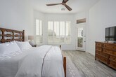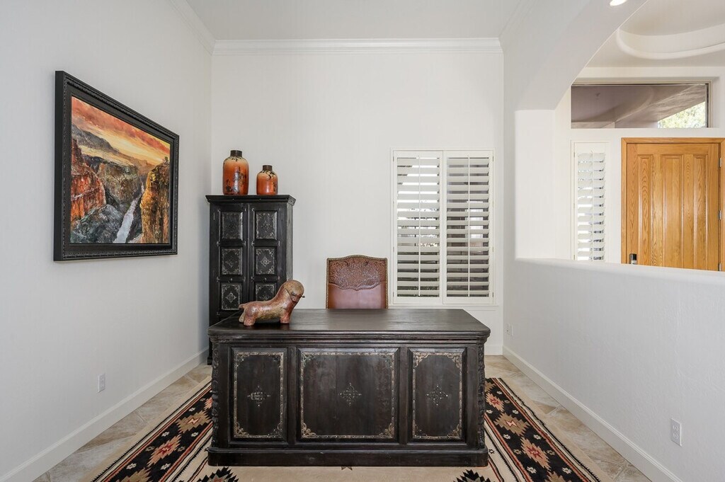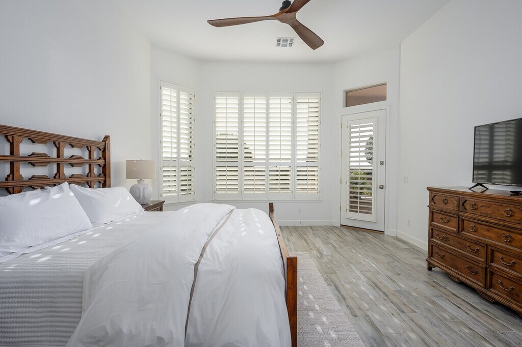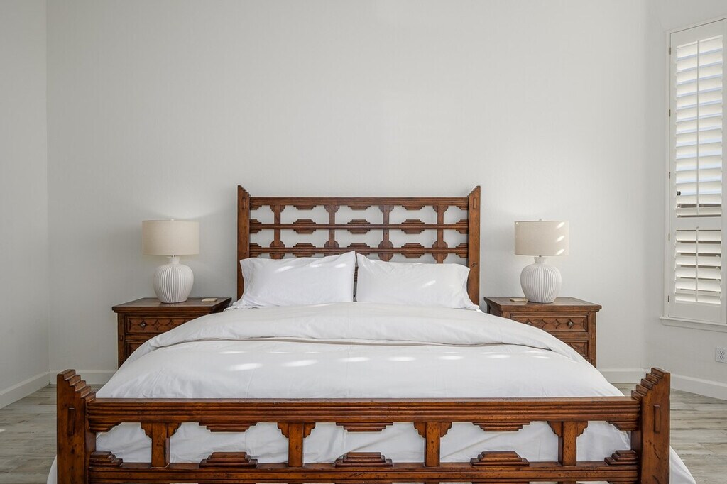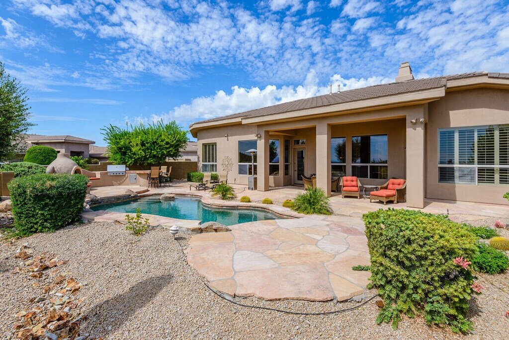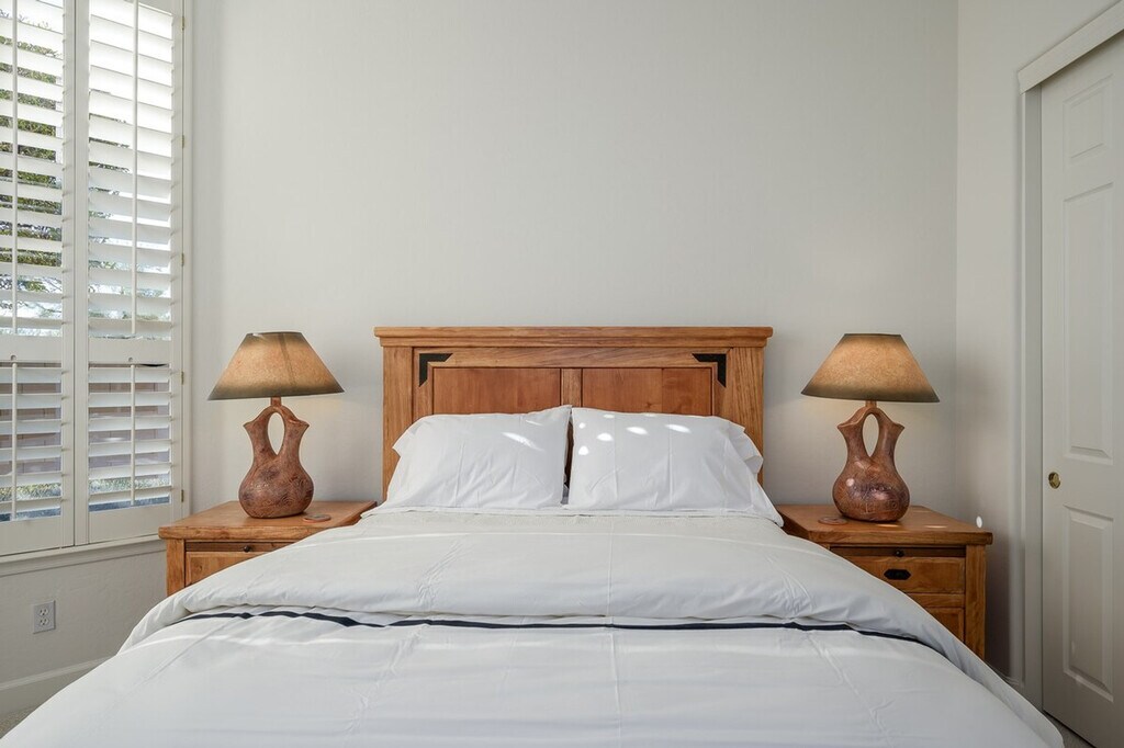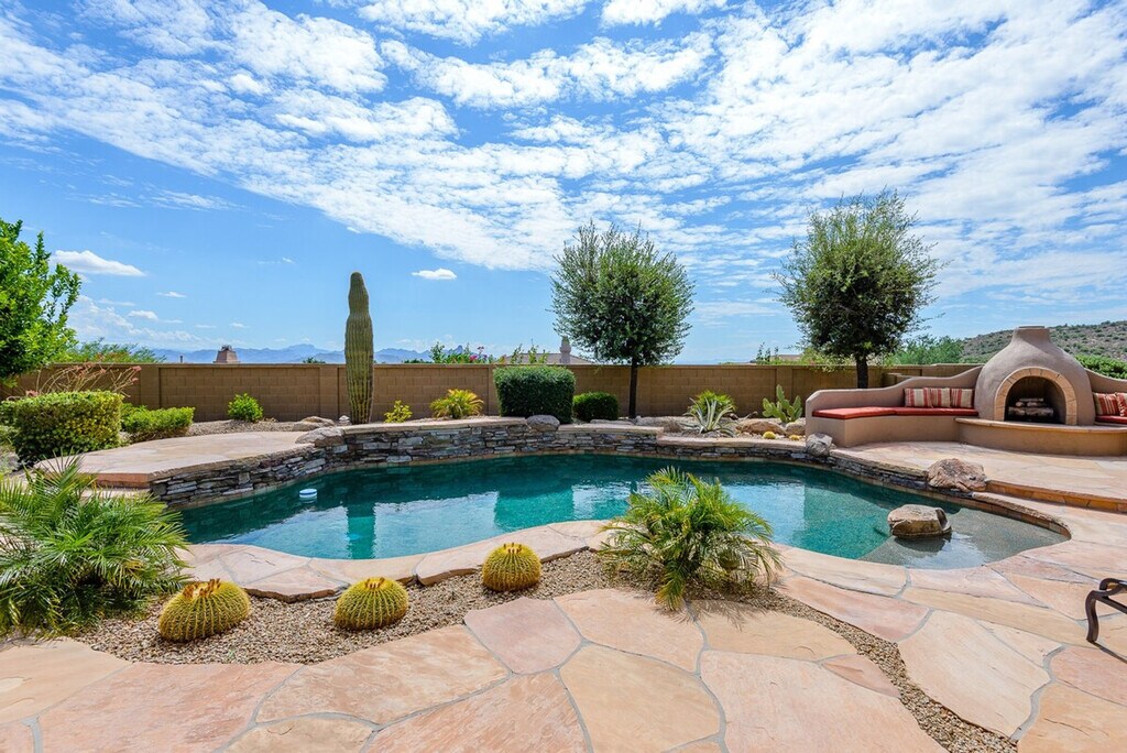 Casa Highland is a single-story home located on the ridge in Fountain Hills, bordering Scottsdale. With high ceilings and tasteful décor, this home makes you feel right at home. The property features three bedrooms and three and a half baths, offering ample space for relaxation and comfort. The master bedroom offers a king-size bed with a smart TV and a huge attached bathroom with a soaker tub and walk-in shower. The second guest suite has a queen-size bed with a smart TV and an attached bath featuring a tub/shower combo. The third guest bedroom also has a queen-size bed with a smart TV and a detached full bath with a combo tub/shower. The great room includes a large open kitchen with a bar, an eat-in kitchen, and a large family room with a smart TV and a natural gas fireplace. Two garage spaces are available for parking. There is a $350 per week or $1300 per month fee to heat the pool to 85 degrees in the winter, available upon request only. An electric cap of $400 per month applies in the summer months from June through September, with guests liable for any overages. Located in Fountain Hills, this home offers easy access to Scottsdale and stunning mountain views. The neighborhood provides a serene environment with various seating and dining options in the backyard, perfect for entertaining and relaxation. No pets are allowed on the property. Guests are liable for any damages caused to the property. An electric lock is available for secure access. All linens, bath, and pool towels are provided, and free Wi-Fi is included. The home includes an office area with a desk and chair, and a printer located in the master closet, making it convenient for remote work. [SI]