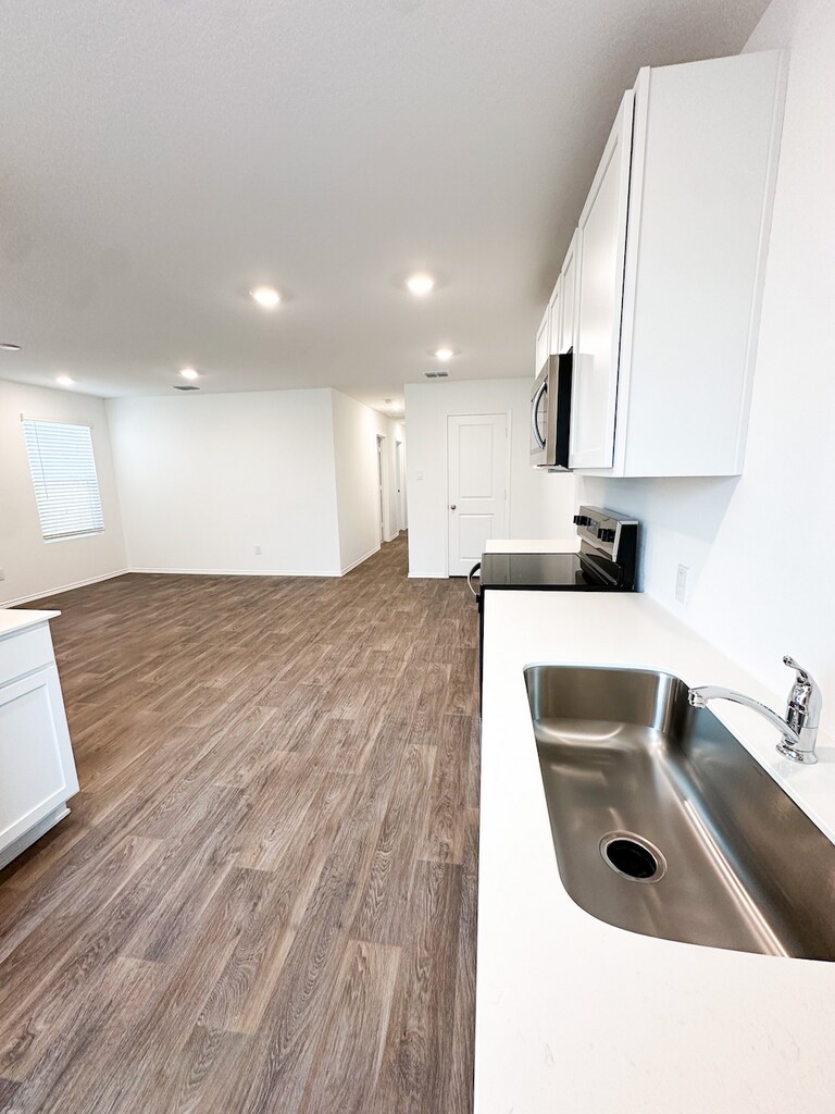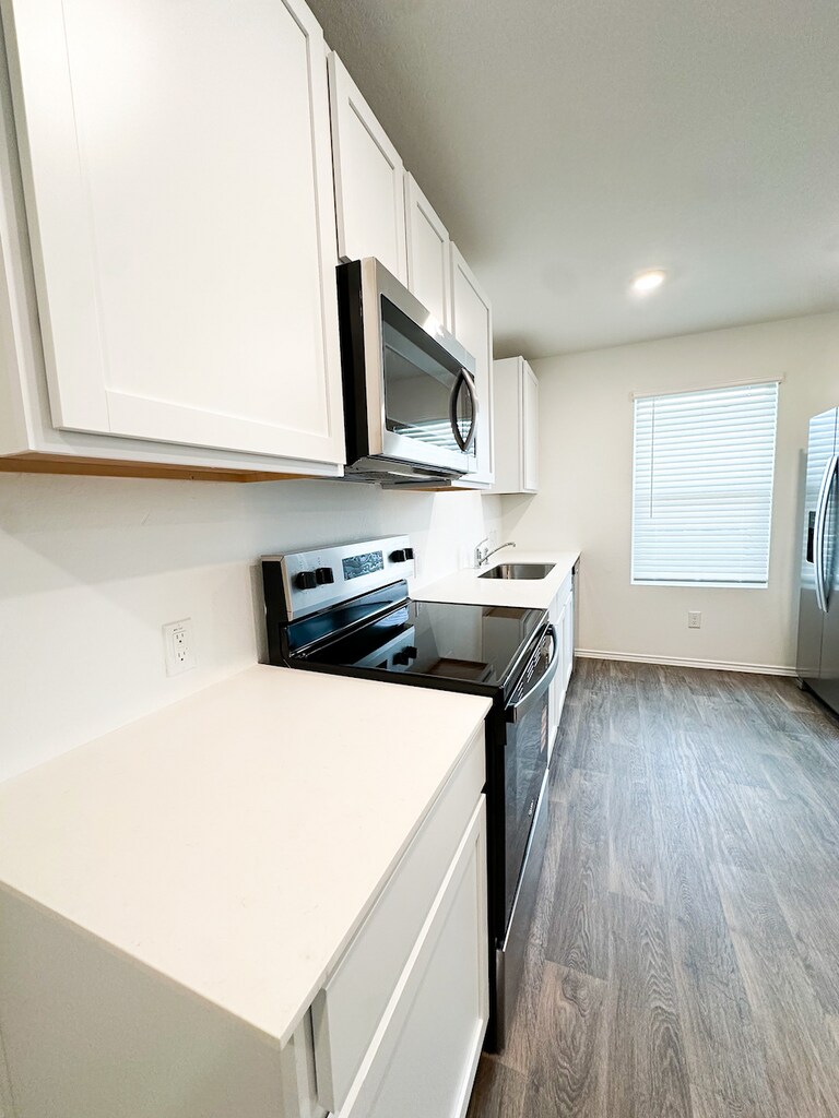 Property Id: 2367458 Welcome to The Gabriel, featured at Sonora in San Antonio, TX, an expertly designed 1-story home offering 1002 square feet of comfortable living space. With 3 bedrooms and 2 bathrooms, this home is perfect for families, couples, or individuals seeking additional room to grow. The Gabriel replaces a traditional garage with a spacious driveway, providing ample parking space and added convenience. The home's exterior is available in two attractive elevation options, both crafted with durable, low-maintenance materials that ensure long-lasting beauty. The Gabriel boasts an open concept interior layout that maximizes the available space, creating a seamless flow between the living room, dining area, and kitchen. The kitchen is a standout feature, complete with sleek quartz countertops, stainless steel appliances, and contemporary shaker-style cabinets, providing both style and function. This inviting space is perfect for cooking meals or hosting guests. The main bedroom offers a tranquil retreat with plush carpet flooring and a spacious walk-in closet for all your storage needs. The ensuite bathroom includes a single vanity with a quartz countertop, complemented by a combined shower and bathtub, providing a relaxing oasis at the end of the day. Additional features of The Gabriel include quartz countertops in all bathrooms and hard surface flooring throughout the living room, kitchen, and all wet areas, making cleaning and maintenance a breeze, also this home has a smart security as well as full appliances for quick move in. Also, this home has a Smart Home Security System along with full appliances.