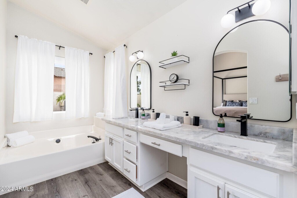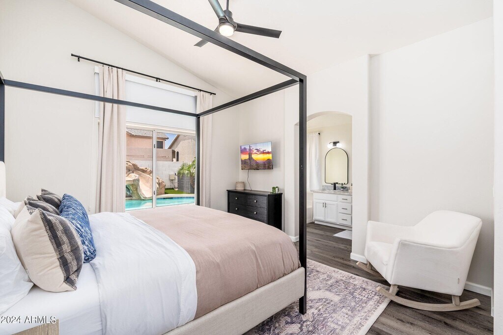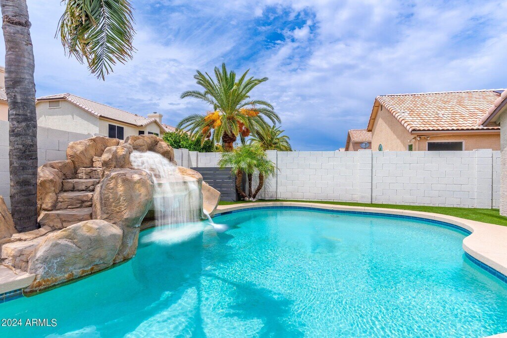 Move in Ready and fully furnished North Scottsdale home ideally located close to shopping,restaurants,entertainment and freeways. The single-level home features an open floorplan,modern finishes and fixtures throughout,as well as a backyard paradise. Discover a sparkling lagoon-style pool with a rock water feature,fire pit and a covered patio. Open-concept kitchen that features quartz countertops,SS appliances and an island with seating,and from here opens to a great room. The primary suite includes a walk-in closet,dual vanity,separate tub and a shower,as well as large windows that look out over the backyard.