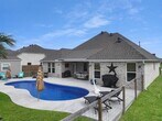 PERFECTION PLUS!! Curb Appeal is just the BEGINNING. Lovely front porch opens to a pretty foyer where you are immediately greeted with a stunning view of the SPARKLING POOL & OUTDOOR SANCTUARY! OPEN FLOOR PLAN FLOWS SO WELL with a gourmet kitchen,quartz countertops,gas cooktop,built-in oven & walk-in pantry! Entertaining is a breeze with spacious dining space & HUGE WORKING ISLAND BREAKFAST BAR! Spacious living SPACE with mounted TV is READY for family and friends! Primary suite is a relaxing retreat with a well appointed ensuite bath. 2 additional bedrooms with full bath on the first floor. Upstairs is your 4th bedroom with full bath or a TERRIFIC 2nd LIVING AREA! The .5 acre lot has it all including a HEATED SALTWATER POOL with water features,mature palm trees,covered patio with TV,& a FABULOUS POOL HOUSE that includes AC unit,serving bar & TV plus additional storage. Plenty of space to store your boat or RV on your additional lot space. Hardin-Jefferson ISD! MLS# 26195484