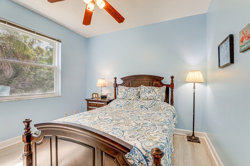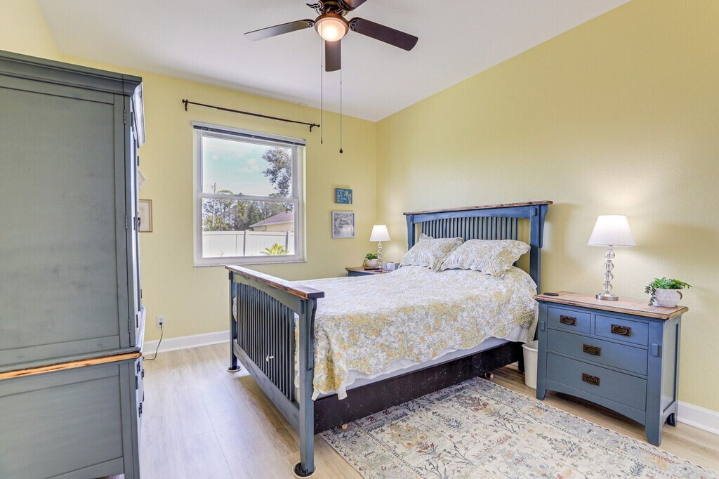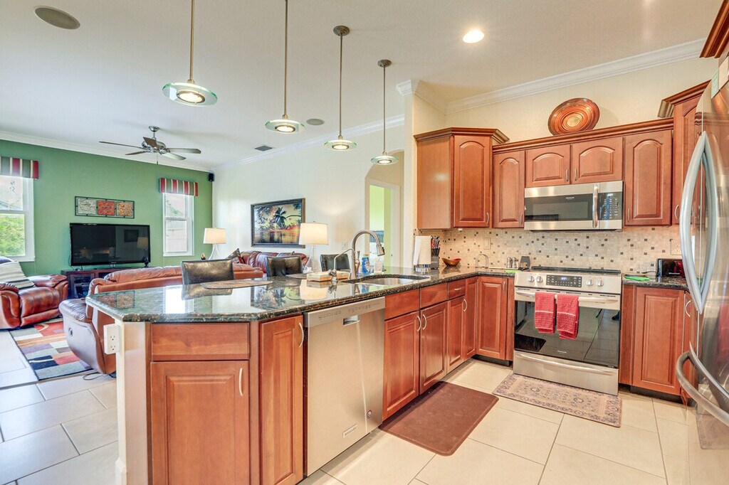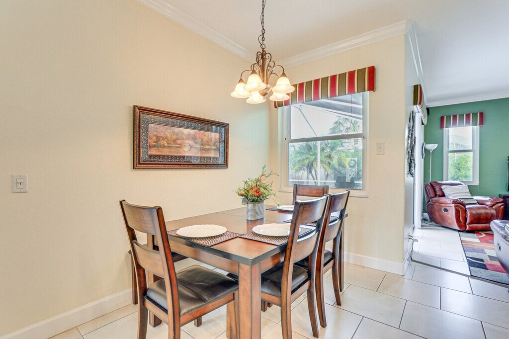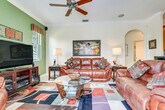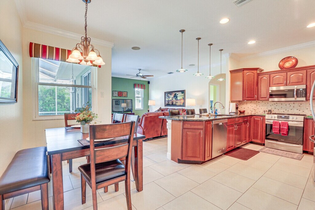 Feel at home in this North Port vacation rental, a 3-bedroom, 2-bath home offering 1,900 square feet of coastal bliss. This single-story home requires one step to enter. This home features smart TVs, free Wi-Fi, an office with a desk and printer, a dining table, and ceiling fans. The fully equipped kitchen includes a dishwasher, coffee maker, blender, slow cooker, toaster, fridge, stove and oven, microwave, breakfast bar, ice maker, dishware, flatware, and cooking basics. Enjoy the convenience of a washer and dryer, as well as provided towels and linens. Relax outdoors with a gas grill, dining area, and yard. Take a dip in the private pool on the screened lanai. Garage parking is available for one vehicle, and driveway parking is available for four vehicles. Enjoy the home's location near local shopping and golf courses. It's 7 miles to Riverwood Golf Club and 11 miles to Port Charlotte Beach Park. Grab a bite at Cocoplum Village Shops on your way home. Smoking, pets, events, parties, and large gatherings are not allowed. Guests must be at least 25 years old to book. This property cannot accommodate electric vehicle charging. [SI]