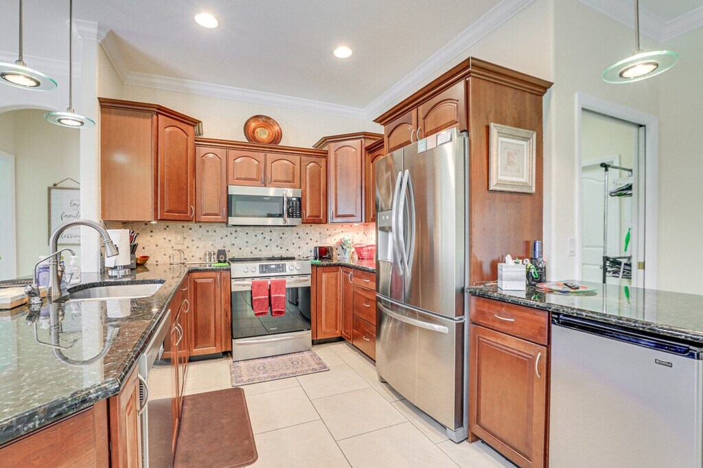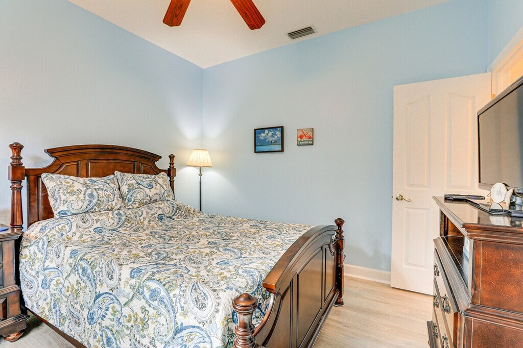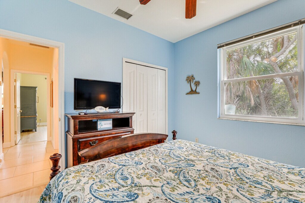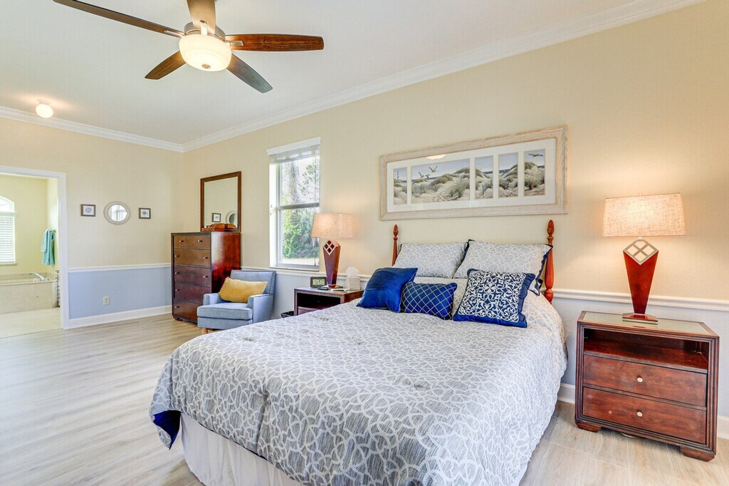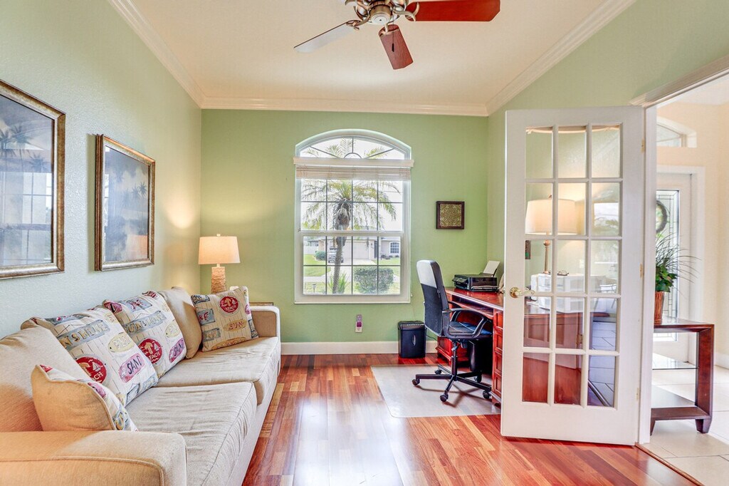 Feel at home in this North Port vacation rental, a 3-bedroom, 2-bath home offering 1,900 square feet of coastal bliss. This single-story home requires one step to enter. This home features smart TVs, free Wi-Fi, an office with a desk and printer, a dining table, and ceiling fans. The fully equipped kitchen includes a dishwasher, coffee maker, blender, slow cooker, toaster, fridge, stove and oven, microwave, breakfast bar, ice maker, dishware, flatware, and cooking basics. Enjoy the convenience of a washer and dryer, as well as provided towels and linens. Relax outdoors with a gas grill, dining area, and yard. Take a dip in the private pool on the screened lanai. Garage parking is available for one vehicle, and driveway parking is available for four vehicles. Enjoy the home's location near local shopping and golf courses. It's 7 miles to Riverwood Golf Club and 11 miles to Port Charlotte Beach Park. Grab a bite at Cocoplum Village Shops on your way home. Smoking, pets, events, parties, and large gatherings are not allowed. Guests must be at least 25 years old to book. This property cannot accommodate electric vehicle charging. [SI]