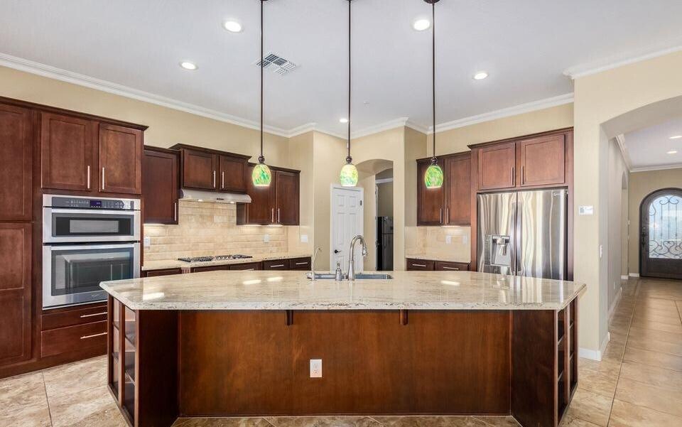 This spacious home offers four bedrooms plus a versatile den,along with a thoughtfully designed floor plan that includes a formal dining room and an inviting family roomperfect for both everyday living and entertaining. The kitchen is well-appointed with built-in appliances,including a gas cooktop,wall oven,and microwave,creating a functional and stylish space for cooking. Additional highlights include a 4-car tandem garage and an extended covered patio,providing plenty of room for storage,outdoor living,and hosting gatherings.