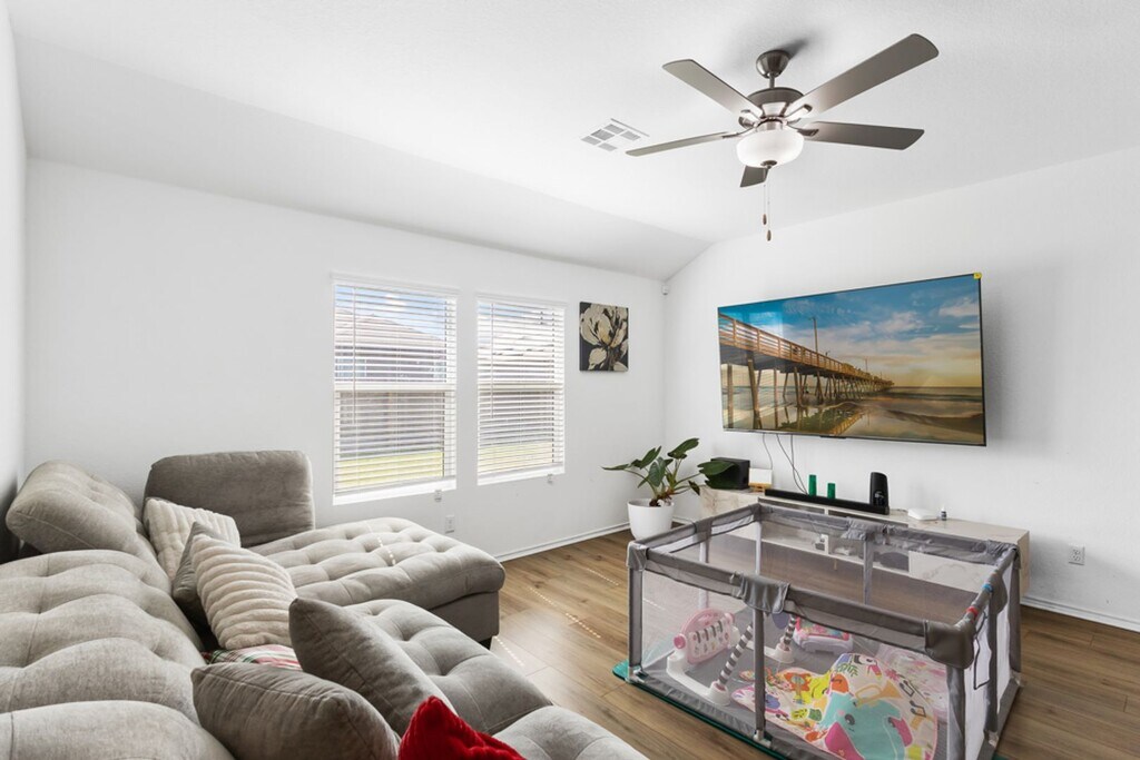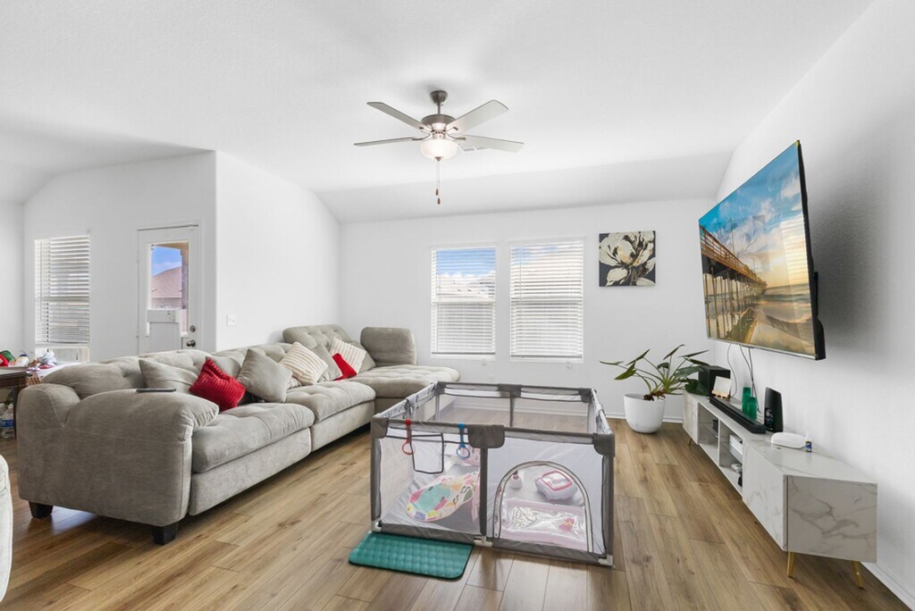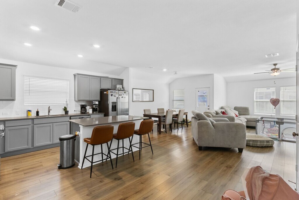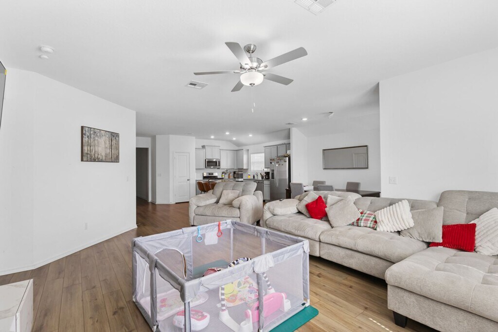 Step into a home that makes everyday living feel easy and comfortable. This 4-bedroom, 2-bath property offers an open floor plan that flows seamlessly from the living area into the kitchen, creating the perfect space for relaxing or entertaining. The kitchen is equipped with gas cooking and comes complete with a refrigerator, while the included washer and dryer add extra convenience from day one. The primary suite provides a private retreat with a spacious bathroom featuring both a tub and separate shower, along with a large walk-in closet. With no carpet throughout, the home feels clean, modern, and easy to maintain. Outside, the sprinkler system helps keep the yard looking its best with minimal effort. Whether you're hosting friends, enjoying a quiet evening, or simply settling into your routine, this home offers a practical layout and comfortable features that make it easy to picture yourself living here.