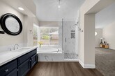 Beautifully remodeled two-story 4 bed / 2.5 bath home featuring a 3-car garage and a range of modern upgrades throughout. Interior includes smooth surface vinyl plank flooring in main living areas, new carpeting on stairs and in bedrooms, and fresh interior paint. The updated kitchen is equipped with stainless steel appliances, including a stove, microwave, oven, and dishwasher. A refrigerator is located in the garage; tenant to provide refrigerator for use inside the kitchen. The property offers tall ceilings, updated windows with wood shutter coverings, ceiling fans, and central heating and air conditioning. Additional features include solar panels, a water softener system, and a Ring video camera system. Plumbing has been fully upgraded with PEX re-piping. Laundry room is located within the home with washer and dryer hookups only. Exterior features include a large backyard with professional landscaping service included. Property has been professionally cleaned and is move-in ready.
