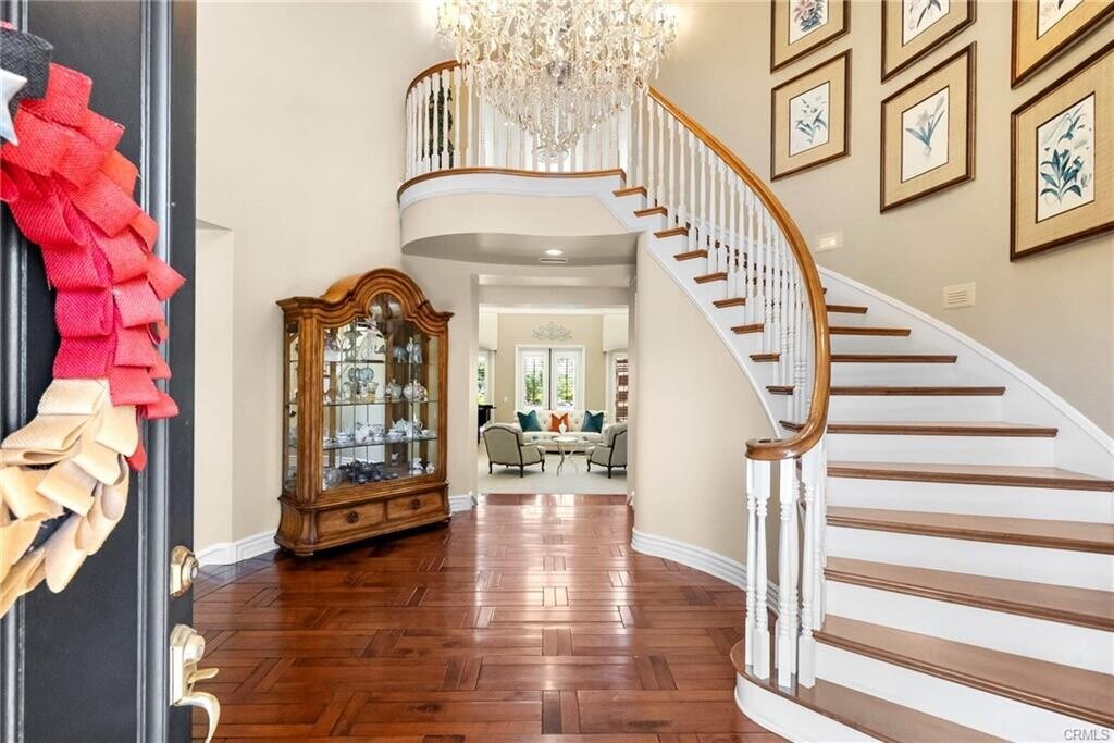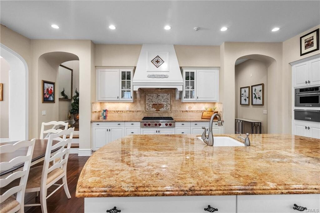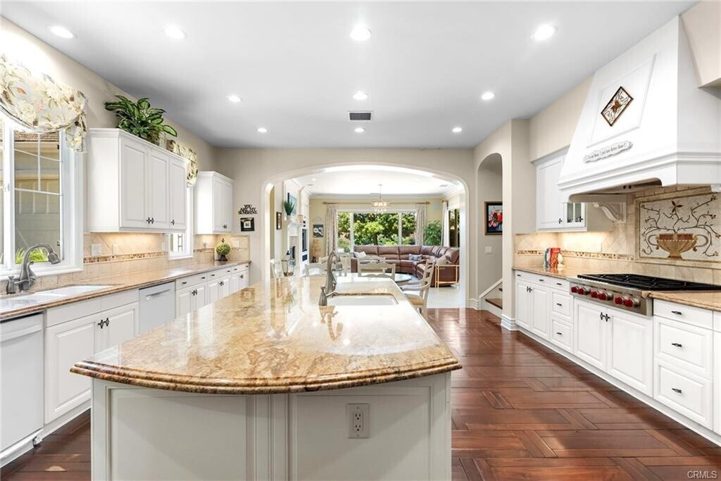 - Welcome to this magnificent 5-bedroom, 5-bathroom pool home estate on the golf course in the prestigious gated community of Robinson Ranch. Located on Live Oak Springs Canyon Rd, this elegant home features a grand pull-through driveway and a stately white exterior with classic black shutters. Inside, crystal chandeliers illuminate the grand staircase, formal dining room, and formal living room, exuding sophistication. The beautifully detailed kitchen is a chef's dream, boasting a large island, pristine white cabinets, soft-close drawers, Sub-Zero refrigerator, KitchenAid appliances, double oven, upgraded Wolf appliances, and a butler's pantry. The stunning mosaic behind the stove adds a touch of artistry. The main floor includes a luxurious primary bedroom with a granite fireplace, spacious walk-in closet, Roman tub, walk-in shower, and direct backyard access. An additional downstairs bedroom with a full bathroom provides ample guest accommodation. Upstairs, a charming den/office, along with three generously sized bedrooms, one with a private bathroom and walk-in closet, and two sharing a Jack and Jill bathroom, offer plenty of space. The home is adorned with custom crown molding, large windows, and shutters, enhancing its timeless appeal. Outside, indulge in the serene backyard oasis featuring a built-in basketball court, heated pebble tech pool and spa with waterfalls, a cozy sitting area with fireplace, covered patio, full pool cabana, and built-in BBQ. The low-maintenance backyard, new tile floors, and aqua link system for pool control add convenience and luxury. Enjoy panoramic views of the golf course and surrounding mountains from this exceptional residence, complete with a 4-car garage equipped with built-in cabinets, sink, windows, doors, house fan, and AC. This estate also features access to top-rated schools, parks, and community amenities, making it an ideal place to call home. Don't miss the opportunity to own this exceptional property in the Sand Canyon/Robinson Ranch community. Schedule your private tour today! Listing provided by: Craig Martin of Pinnacle Estate Properties, Inc. LA State License 1939259 Listing posted by Gary Cole [SYNDID 4142614 11052025]