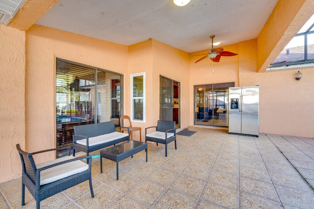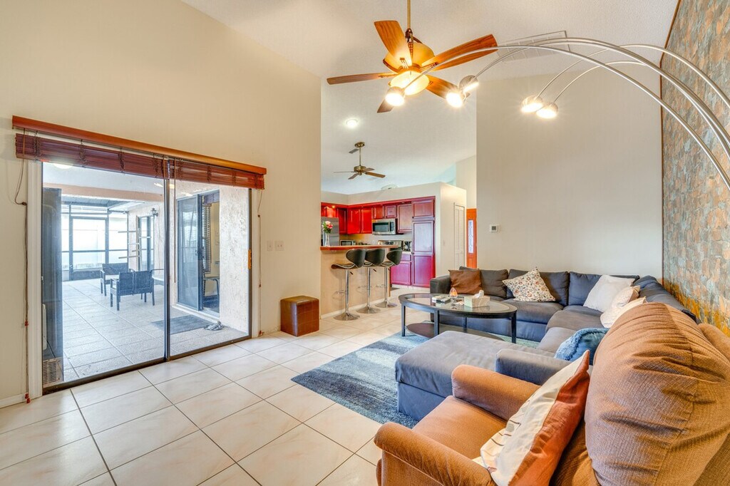 Feel at home in this Orlando vacation rental, offering 3-bedrooms and 3-baths. This single-story house requires using 1 step to access. Spend your next stop in the Sunshine State in style. This house is equipped with smart TVs with cable, dining tables, and office desks. The en-suite bathrooms feature walk-in showers and walk-in closets. The kitchen includes a refrigerator, stove/oven, microwave, dishwasher, Keurig and drip coffee makers, an electric kettle, dishware and flatware, and cooking basics. Enjoy free Wi-Fi, towels and linens, an iron and board, central heating and A/C, and ceiling fans. Guests will have access to the entire property via self check-in. Driveway parking is available for up to 4 vehicles. With a private pool, peaceful lakefront setting, and prime location surrounded by golf courses and nature trails, this house is perfect for an extended Florida retreat. Visit Epcot, shop and dine at the Loop Kissimmee, or catch a game at the Kia Center! Then, end the day back home relaxing on the furnished lanai. Enjoy the fenced backyard and lake view. No events, parties, or large gatherings are allowed. Guests must be at least 25 years old to book. This property features 8 exterior security cameras. Cameras 1, 2, 3, and 4 are located on the front of the home facing the front yard, driveway, and main entrance. Cameras 5 and 6 are located on each side of the house facing the side yards. Cameras 7 and 8 are located on the rear exterior of the home facing the lanai and backyard. These cameras do not look into any interior spaces. The cameras record audio only when activated by motion. Smoking and pets are not allowed. [SI]