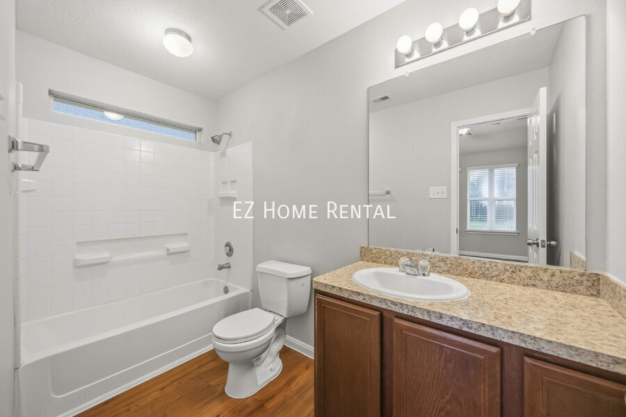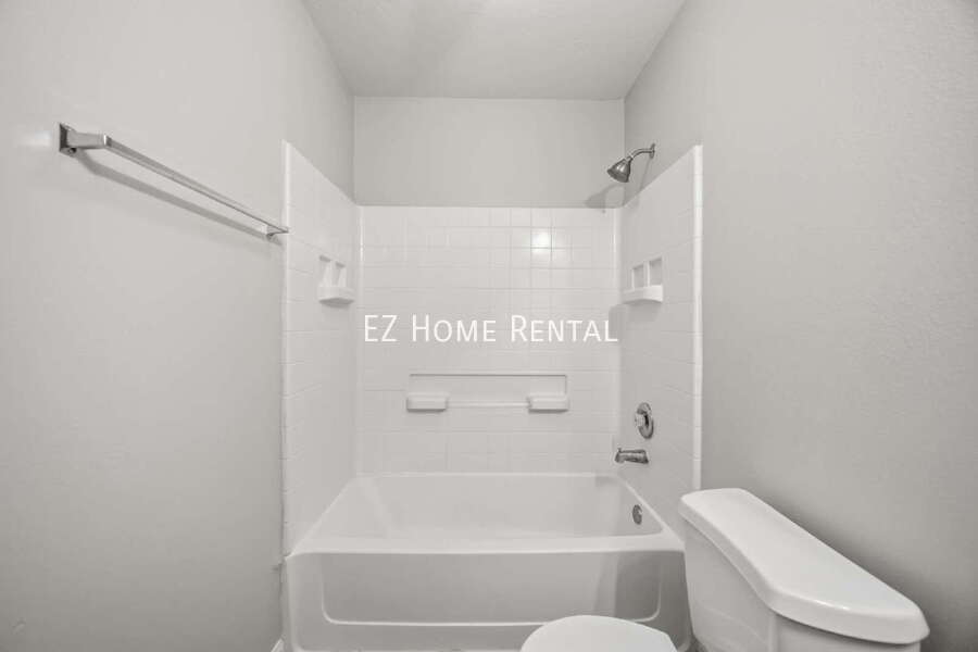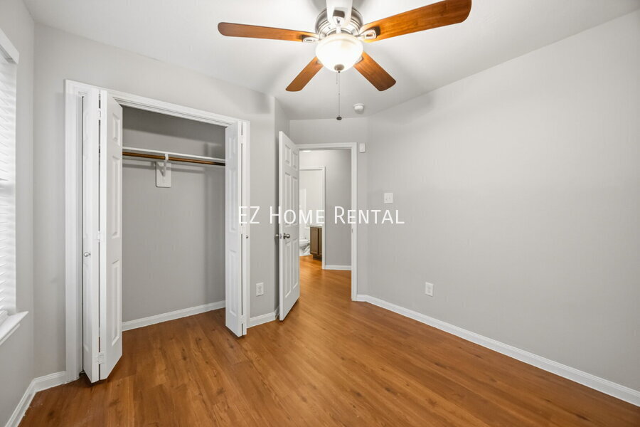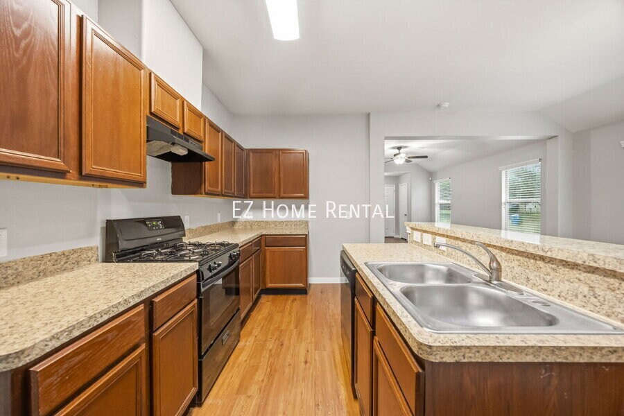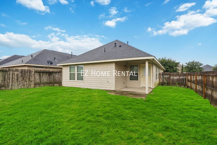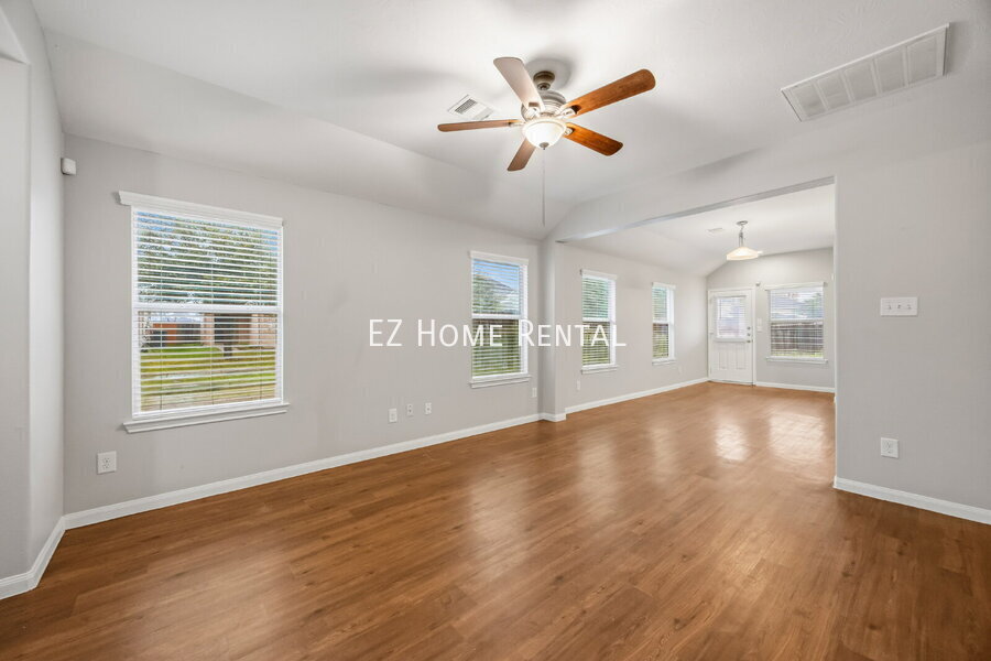 This home featuring ceiling fans and central air conditioning for year-round comfort. The spacious living room offers durable vinyl flooring that flows throughout the home, creating a clean and cohesive look. The dining area includes a convenient bar-top counter, while the kitchen overlooks the dining space and is equipped with a gas stove and oven—ideal for everyday living. The primary bedroom features a walk-in closet and a private en-suite bathroom. Step outside to enjoy a large, fully fenced backyard, perfect for outdoor relaxation or entertaining. This move-in-ready home offers thoughtful upgrades and versatile living spaces. Washer, dryer, and refrigerator are not included. Conveniently located with easy access to I-45, the home provides quick commutes and close proximity to shopping, dining, and entertainment. Don’t miss out—EZ qualifications available. Apply today and schedule your self-showing to move in quickly!Vinyl Plank Flooring