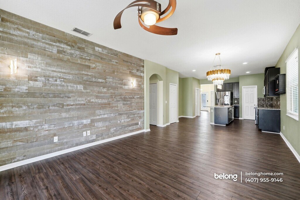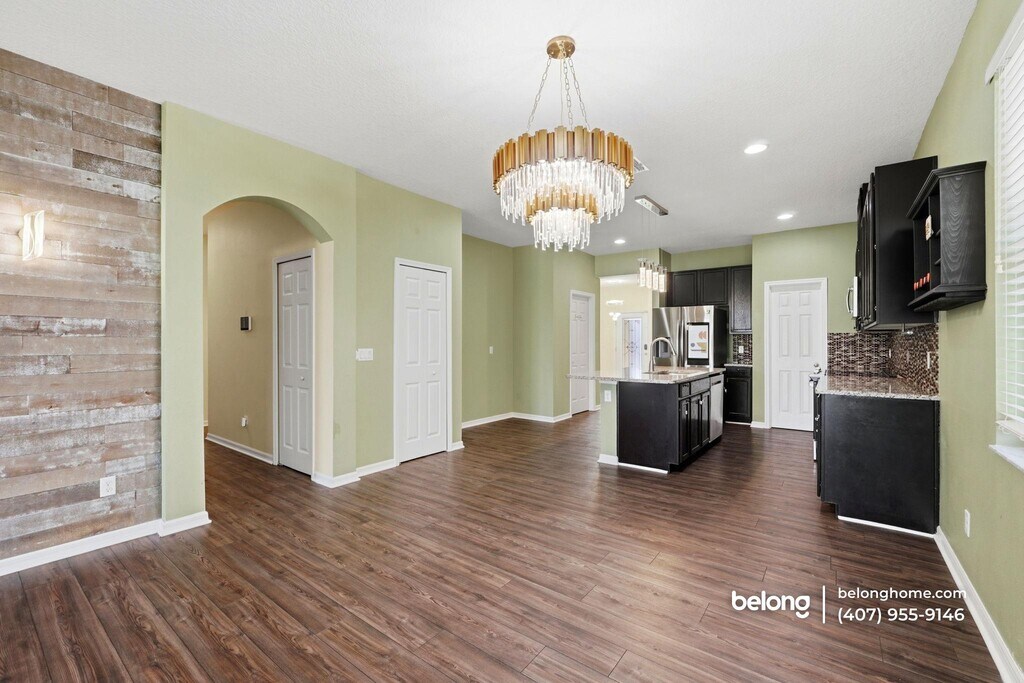 Warm features and thoughtful touches give this 3-bedroom, 2-bath abode a welcoming feel, highlighted by its screened patio, spacious yard, and added storage that helps keep daily living organized. Its façade features a covered entry framed by mature palms, setting a comfortable tone before you even step inside. Your main living area offers room for relaxation and gathering, supported by wide windows that draw in natural light. Soft wall tones pair with wood-style flooring for a cozy backdrop, while the adjoining dining area sits in an easy position for everyday meals or casual hosting. In the kitchen, dark cabinetry provides generous storage, joined by sleek counters, a central island with seating, and stainless steel appliances arranged for straightforward cooking. Steps away, the screened patio plus the tranquil backyard create a lovely extension of your living space. You’re in a convenient part of St. Cloud, close to everyday essentials. Nearby options include Publix, Aldi, and Walmart Neighborhood Market for groceries, along with The Home Depot and various shops at Narcoossee Shoppes. Local dining spots, parks, and cafés are also within easy reach. Lakefront Park, with its scenic walking paths and waterfront views, adds a pleasant outdoor escape. *Our homes come as-is with all essentials in working order. Want upgrades? Request it through the Belong app, and our trusted pros will take care of the rest!