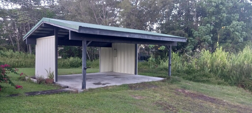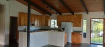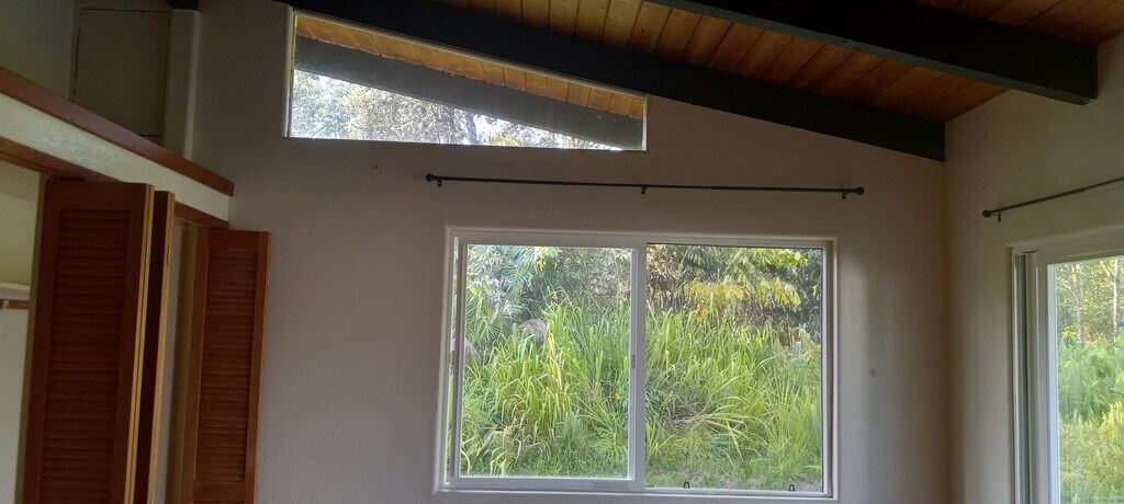 Unique 3 bedroom/2 bath open beam home with detached 2-car carport. Large covered lanai off the living room. Lots of natural light. Kitchen appliances include refrigerator, dishwasher and propane range. Hot water heater is on demand. Laundry closet is in the hallway. Flooring in open area is stained concrete with laminate in the rest of the home. Master bedroom bath is open shower, clear glass door and glass sliding door to the outside. On water catchment. Large grassy yard with basic lawn service included.
