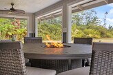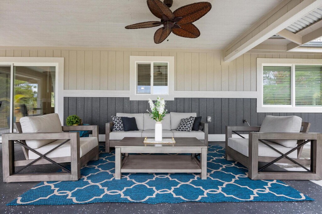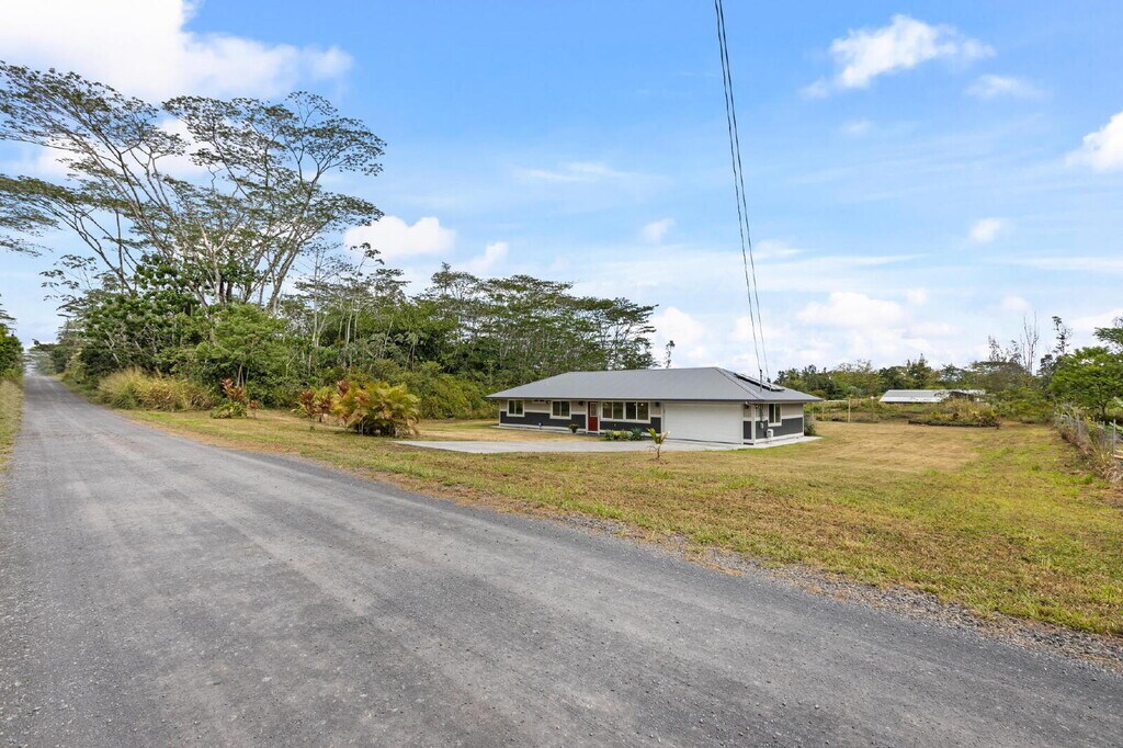 Better than New, Experience Turn-Key Luxury Living in Big Island's Sought-After Hawaiian Paradise Park. This 2021-built modern residence presents approximately 1,330 Sq Ft of refined interior living plus an estimated 400+ Sq Ft finished-style garage, creating over 1,700+ Sq Ft under roof all situated on a full acre of cleared, landscaped land offering privacy, space, and a peaceful island atmosphere. This home is not simply "move-in ready" it delivers a complete, curated lifestyle, thoughtfully furnished and fully equipped from day one. The kitchen is a standout centerpiece, featuring full-slab granite countertops, premium stainless steel appliances, a French door refrigerator, induction range, air-fryer oven, deep-basin sink with professional faucet, and elegant cabinetry. The culinary experience is elevated by a Breville barista espresso & cappuccino maker, Blendtec blender, premium pots, pans, utensils, and professional chef's knives a true turn-key kitchen that requires no additional purchases. Pendant lighting, a modern chandelier, recessed LEDs, and comfortable bar seating complete the space. The open-concept great room flows seamlessly into the kitchen and lanai, furnished with a 75-inch 4K smart TV, power-reclining leather sofa, luxury massage chair, and coordinated decor. Large windows and a tray-ceiling fan create a bright, comfortable, and stylish gathering space perfect for relaxation or remote work. Bedrooms are fully furnished with quality bedframes, premium bedding, rugs, and ceiling fans. The primary suite offers a luxurious bathroom with stone-look porcelain flooring, full-slab granite dual-sink vanity, designer mosaic-edge mirrors, and a frameless-glass walk-in shower. A custom walk-in closet system adds functionality and order. The outdoor living environment elevates this home far beyond standard rentals. A generous 300+ Sq Ft covered lanai serves as a second living and dining pavilion, offering premium outdoor seating, a full dining table, and a fire-feature dining setup for cool island evenings. Double oversized tropical ceiling fans, an outdoor rug, and tasteful furnishings create a true indoor-outdoor oasis. The finished-style two-car garage expands the home's versatility with an installed EV charger, high-end rowing machine, clean storage solutions, and space for vehicles plus equipment. A Sleek Pinguino A/C unit provides targeted cooling when desired, complementing the home's energy-efficient construction. Water and infrastructure are exceptional: a 10,000-gallon catchment tank, Aquasana Whole House Rhino Filtration with UV, dedicated pump, and septic system ensure high water quality, low maintenance costs, and independence from municipal services. The full acre includes side gardens, a passion fruit zone, two avocado trees, two lime trees, a dozen white pineapples in a dedicated patch, and a dozen young coconut palms, giving the property both beauty and productive potential. With its premium furnishings, complete kitchen kit, cutting-edge water system, outdoor living pavilion, EV-ready garage, fitness equipment, orchard plantings, 75-inch TV, and refined interior finishes, this home stands as a rare luxury offering in the Hilo Keaau rental market ideal for professionals, medical staff, remote workers, and anyone seeking a fully realized, high-comfort living experience from the very first day.