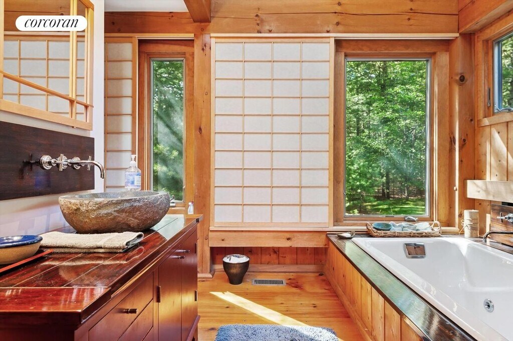 East meets West in this sensational 3000 SF post & beam residence nestled amid the natural privacy of 1.5 acres in East Hampton's desirable near Northwest. There's a distinctive, elegant yet relaxed Zen vibe throughout with a bright and open living, dining, kitchen area flanked by a wall of glass sliders all accessing the gorgeous deck, gardens, lawn and pool beyond. Single-level living offers comfort, convenience and privacy with 2 generously sized en suite bedrooms at either end of the house, each with custom baths, Japanese shoji screens and double height ceilings. Additionally, there's another guest bedroom and full bath plus a den/office. Upstairs overlooking the living room is an cozy loft, perfect for fun and games, an afternoon read or a quick nap. Outside, expansive cedar decks offer plenty of room for dining, entertaining and lounging. There's a beautiful 20x40 gunite pool surrounded by a huge lawn, towering evergreens and flowering garden beds. A very special spot to make great summer memories. [[Rental Registration # RR-26-10]]