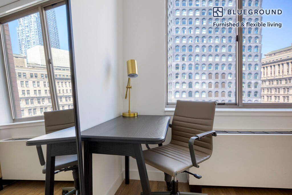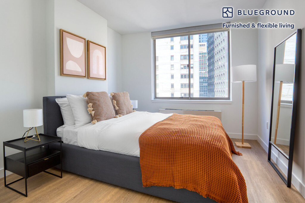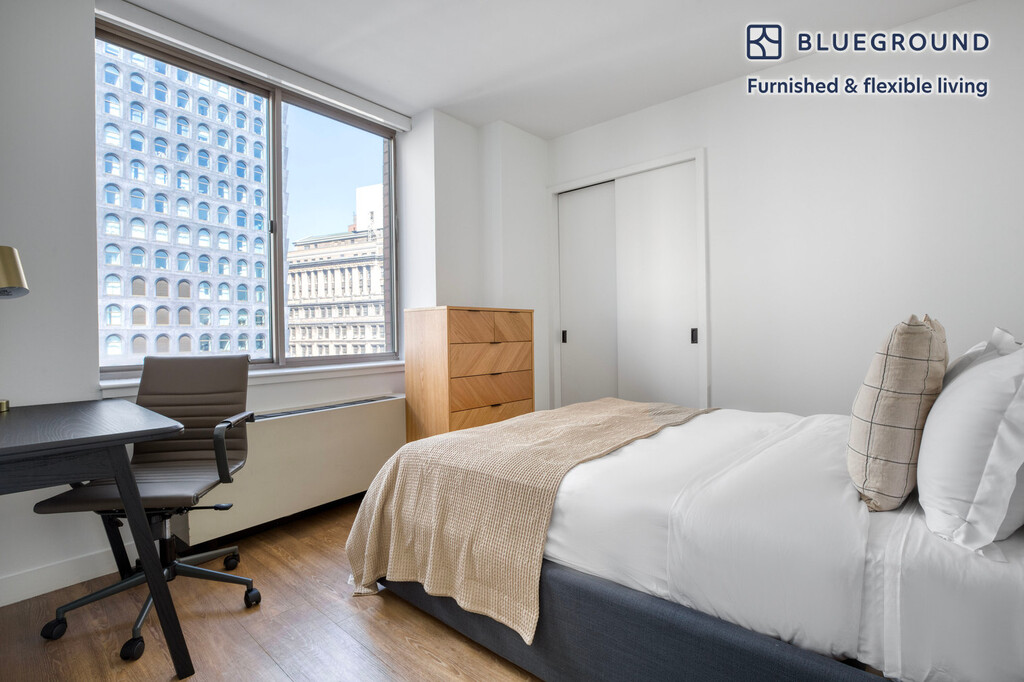 Feel at home wherever you choose to live with Blueground. You’ll love this lovely Financial District furnished two bedroom apartment with its modern decor, fully equipped kitchen, and exquisite living room with great high floor views. Ideally located, you’re close to all the best that New York has to offer! (ID #NYC1445) The advertised rate of $4,420/month is the lowest available price, based on a 1 month(s) and 3 day(s) stay with a move-in date of December 21, 2025. If you’re looking for a 1-year stay, the rate is $6,580/month. Rates vary depending on the duration of stay, season, and other parameters. For exact pricing and additional pricing components, please visit our website and enter your desired move-in and move-out dates. The rate is applicable when billed upfront; it can be higher if billed in multiple payments. Brokers are welcome to reach out. Were you looking for an unfurnished lease? Try Blueground instead and upgrade from unfurnished to furnished living: - Furnished at rates comparable to unfurnished - No setup or furniture costs - save thousands - Move-in ready - save time, just bring your suitcase Designed with you in mind Gorgeous furniture, fully equipped kitchen, smart TV, and a premium wireless speaker are just a few of the amenities you’ll find inside this two bedroom apartment. Ideally located in New York, you’ll find a lot to love outside as well. When you’re ready to relax, you’ll be happy to discover every Blueground bedroom comes with superior quality mattresses, luxury linens, and cozy towels. We handle everything so you can simply show up and start living. This apartment also offers in-apartment laundry. Sleeping arrangements Queen Bed, 63in/160cm Queen Bed, 63in/160cm Amenities Building amenities unique to this two bedroom apartment include an on-site: - Doorman - Dryer - Elevator - Washing machine - Lounge - Pets allowed Arrival and ongoing support The entire apartment is yours to enjoy! Throughout your stay, you’ll have access to our Client Experience team through the Blueground App. You can schedule additional cleanings, submit maintenance requests, and view our neighborhood recommendations with just a few taps. We’ll share all details upon confirmation of your stay. Ideally Located This furnished apartment is located in the Financial District, also known as FiDi. Home to Wall Street, One World Trade Center, the South Street Seaport, and Bowling Green it is a constant hub of activity. During the week the sidewalk is always bustling and the restaurants are filled with professionals. The glittering skyscrapers and well-known landmarks make this one of the city’s most recognizable and historic neighborhoods. By subway, Times Square is about 20 minutes away. Other things to note Building amenities may have an extra cost. This Blueground apartment has flexible lease options, allowing you to book it for one month, a year, or more. Pets are welcome, though weight limits and breed restrictions apply and may incur fees. Brokes CYOF. We take great pride in ensuring every photo displayed is shot in our own units with our actual furnishings. That said, we regularly refresh our decor and furniture arrangement, which may differ from what’s pictured. [SI]