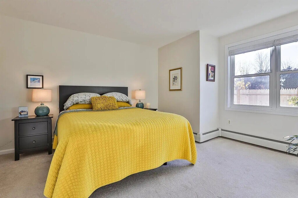 This spacious first floor unit. Inside features a spacious kitchen with white cabinetry and granite counters along with stainless appliances. The sunny open concept living and dining area is open to the kitchen and front hall. Off the main living area is a full bathroom and a main bedroom with large closet.