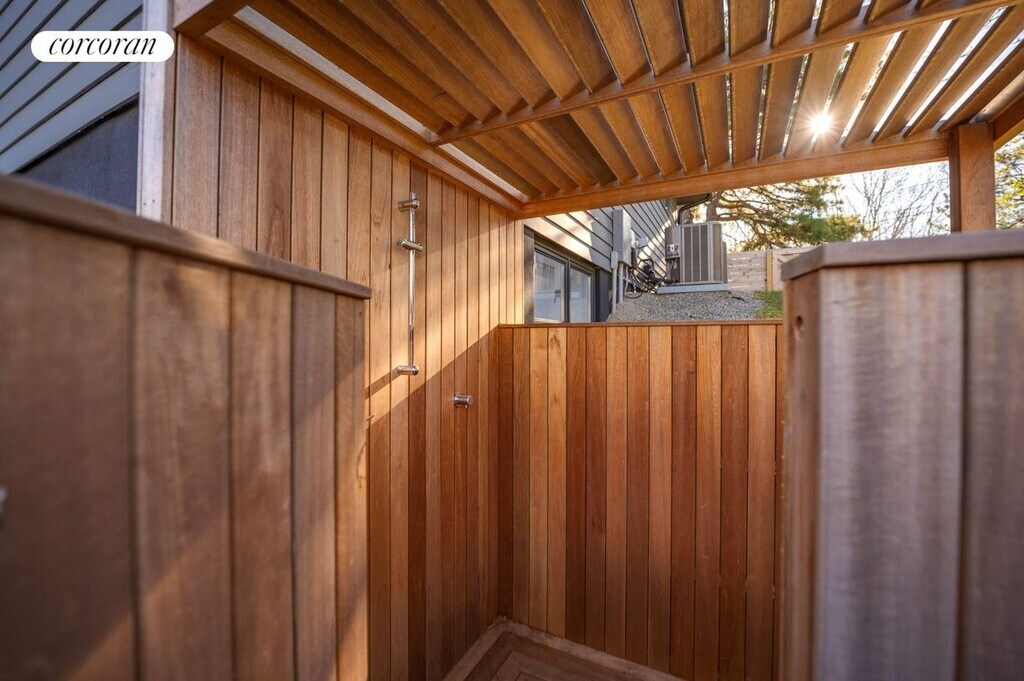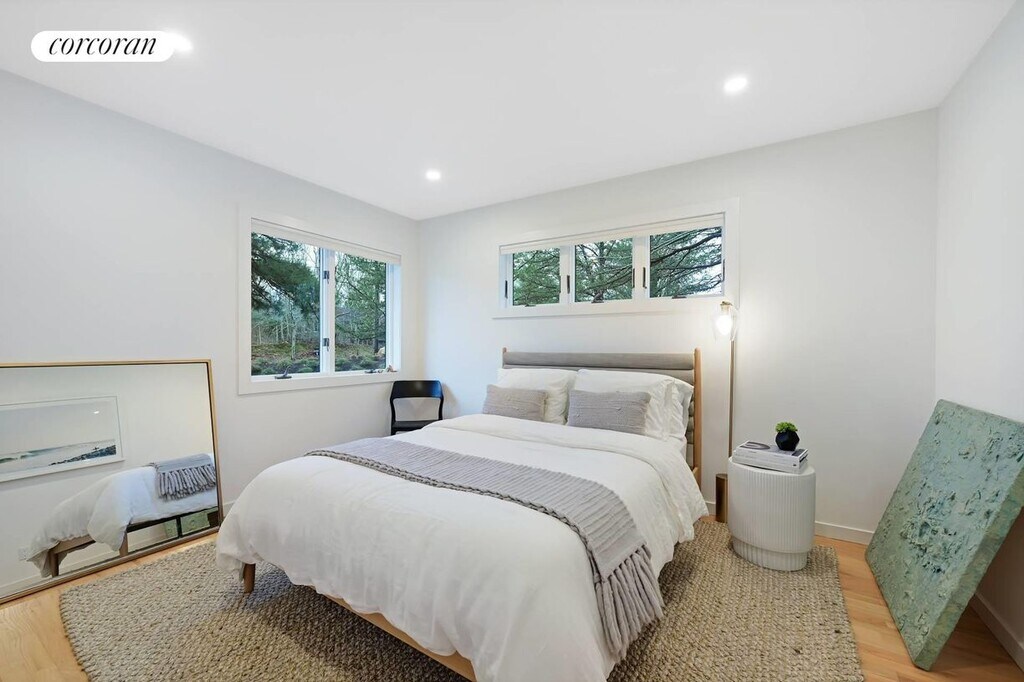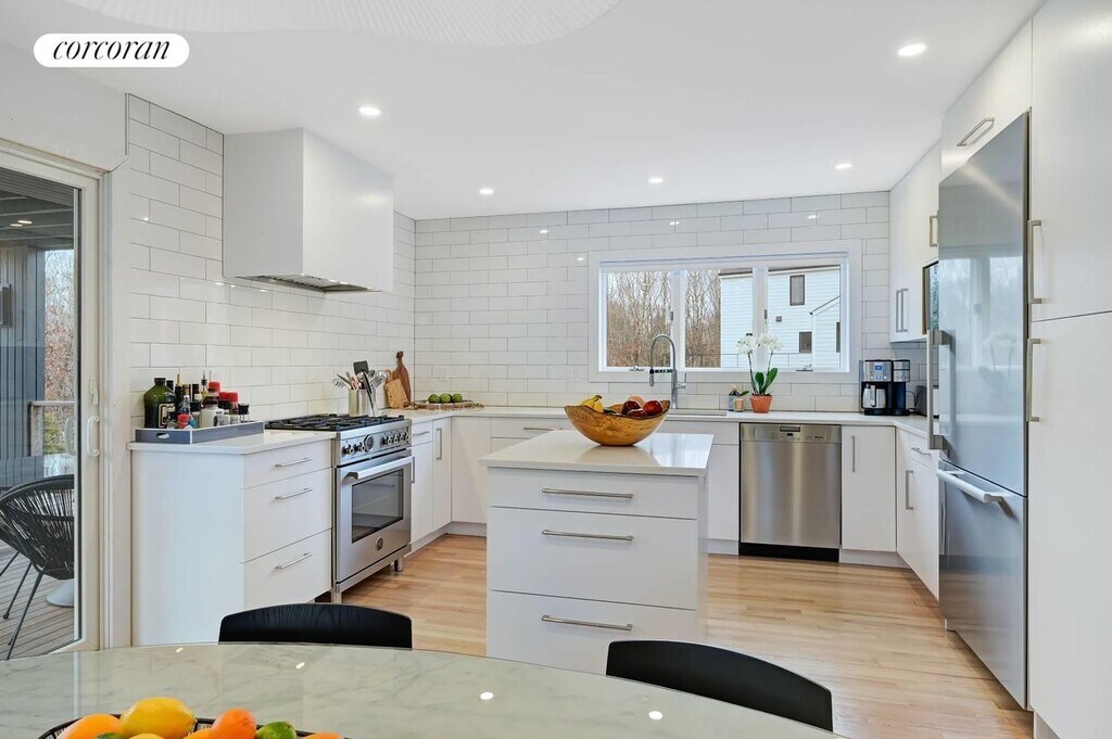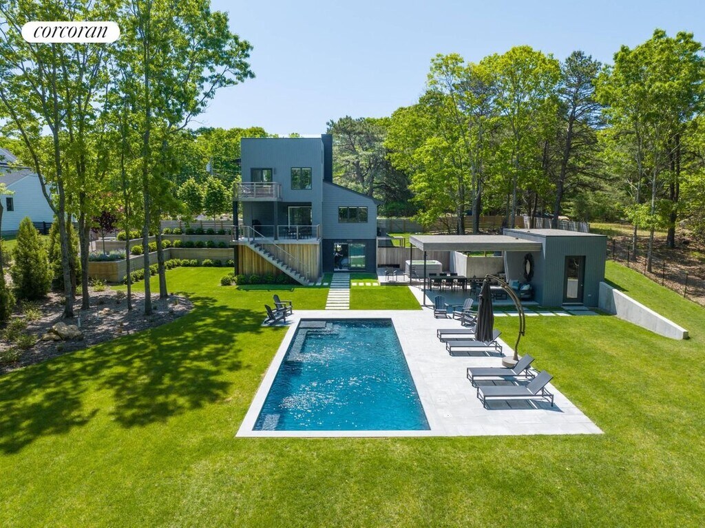 Make summer memories in this perfect modern home in Sag Harbor, completely renovated with sleek decor and a heated saltwater pool. Set amid lush landscaping on 0.60 acre backing up to a reserve, you will appreciate the peace and quiet. Impeccably finished, this home features 4 bedrooms and 3 baths over three levels. On the main level, you can enjoy an open concept floor plan with a beautiful kitchen, living, and dining area overlooking the grounds and pool area. The dining room opens to a private outdoor deck which is great for entertaining. The first floor also features a guest bedroom, bathroom, and pantry. The second floor primary bedroom suite is completely private with its own balcony! In the finished lower level walk-out, you will find two additional guest bedrooms, a bathroom, a den/office, and a laundry area. The outdoor living spaces are designed for relaxation and entertaining with multiple decks, an outdoor covered lounge area, and plenty of seating by the pool. There is also an outdoor shower, hot tub, and fire pit area to top it off. It is serenity within easy reach to Bridgehampton and Sag Harbor Villages, bay and ocean beaches, and some of the Hamptons' best restaurants and shops. [[Rental Registration # RP240317]]