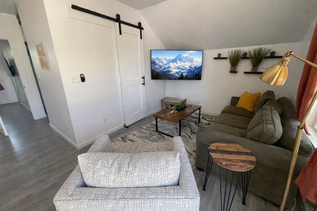 Feel at home in this bright, modern upper-level apartment in the heart of Colorado Springs. The space features a comfortable living area with a sofa sleeper and smart TV, a fully equipped kitchen with stainless steel appliances, and clean, contemporary finishes throughout. The bedroom has a queen bed with quality linens and an open closet system. A full-sized stackable washer and dryer are included. Enjoy your private outdoor seating area with unique Colorado-inspired ski chairs, a firepit and a gas grill. This apartment is located in a neighborhood in Downtown Colorado Springs with a mix of residential and commercial properties. It's within walking distance of area restaurants and bars. Ubers, scooters, and electric bikes are available in the area. No pets and no smoking are allowed. [SI]