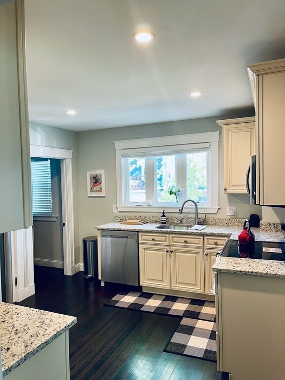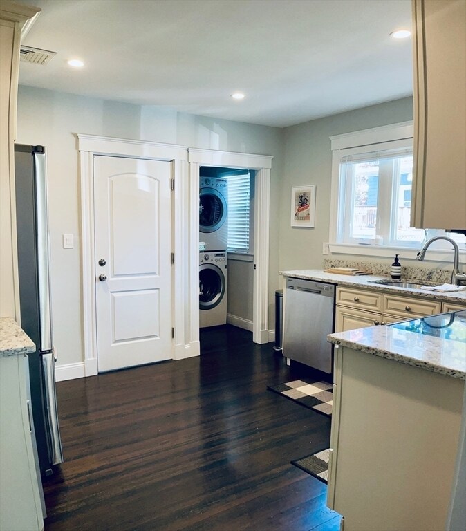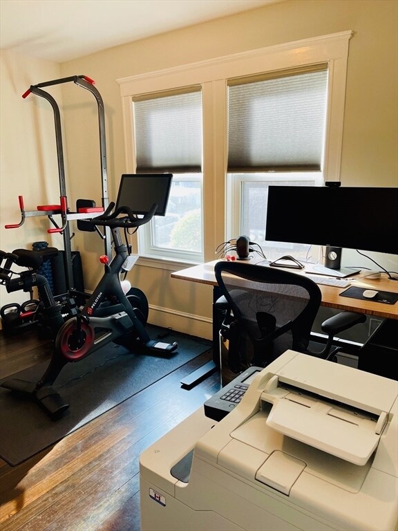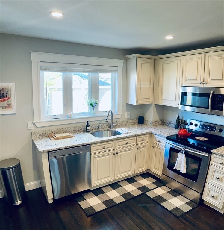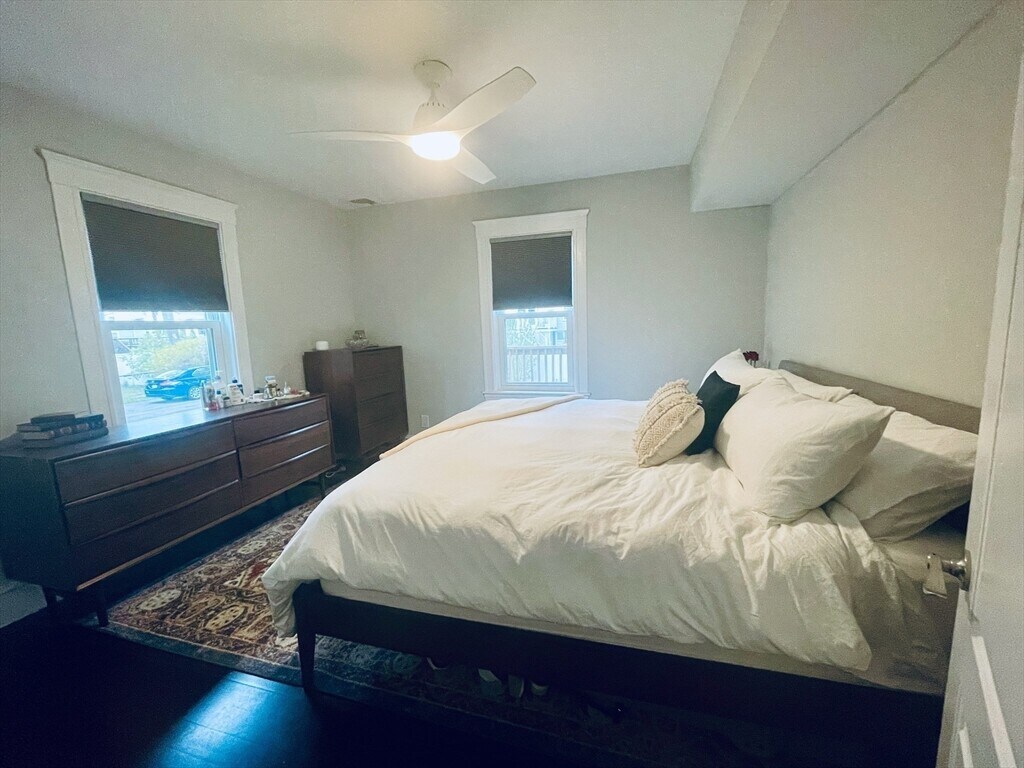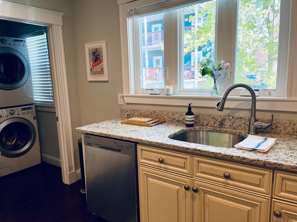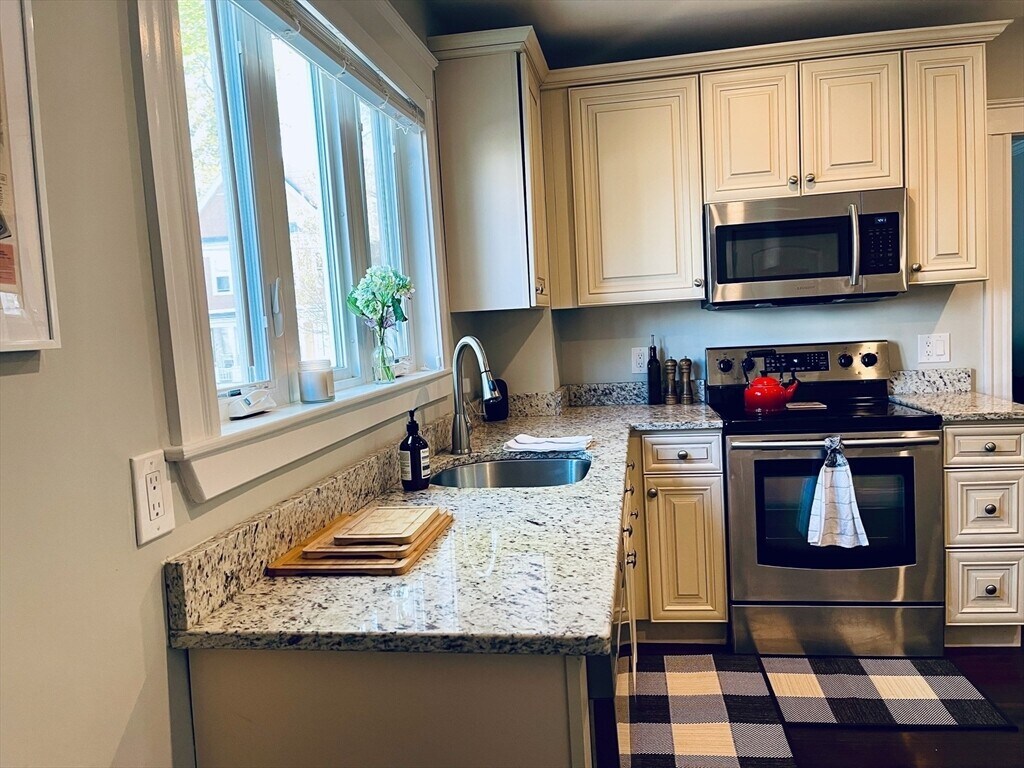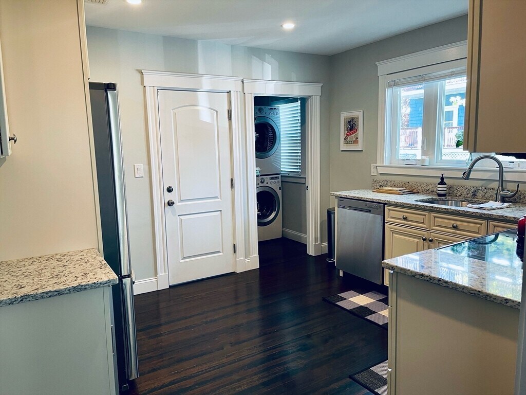 Stylish,sunny and spacious first-floor unit in one of Roslindale’s most desirable neighborhoods. Fully gut renovated in 2016,this home offers an open floor plan with a large living room flowing into the dining area. The modern kitchen features granite countertops,stainless steel appliances,and a wine fridge. Two generously sized bedrooms,an updated bathroom,in-unit washer/dryer,recessed lighting,and central AC add to the appeal. Enjoy two driveway parking spaces,a welcoming front porch,and a private rear deck overlooking a shared backyard.The location is exceptional—walking distance to the Arnold Arboretum,Centre St,Fallon Field,bus lines,and the commuter rail,with a 20-minute ride to South Station. Roslindale Village,with its great restaurants and shops,is only a 10-minute walk. Quick access to West Roxbury,Jamaica Plain,the Longwood Medical Area,and Forest Hills Station makes this a truly convenient place to live. MLS# 73436231