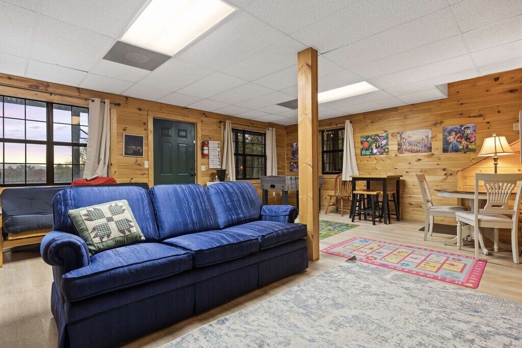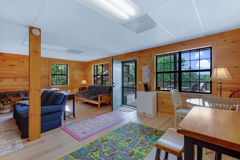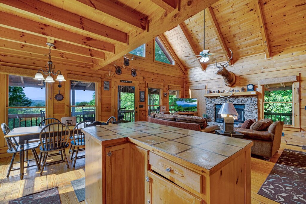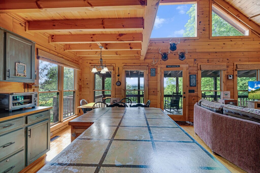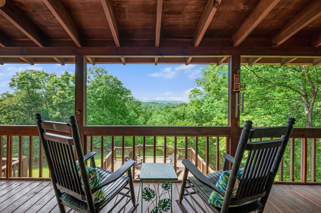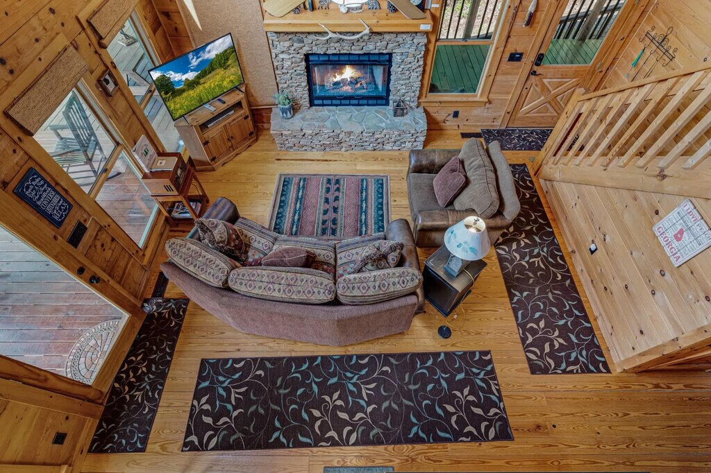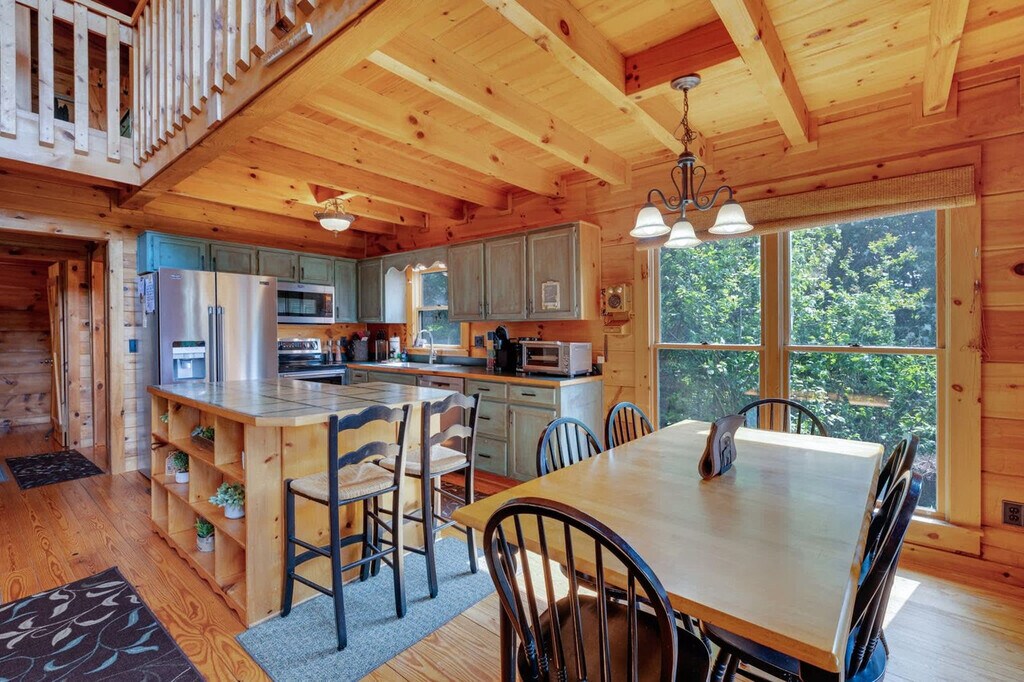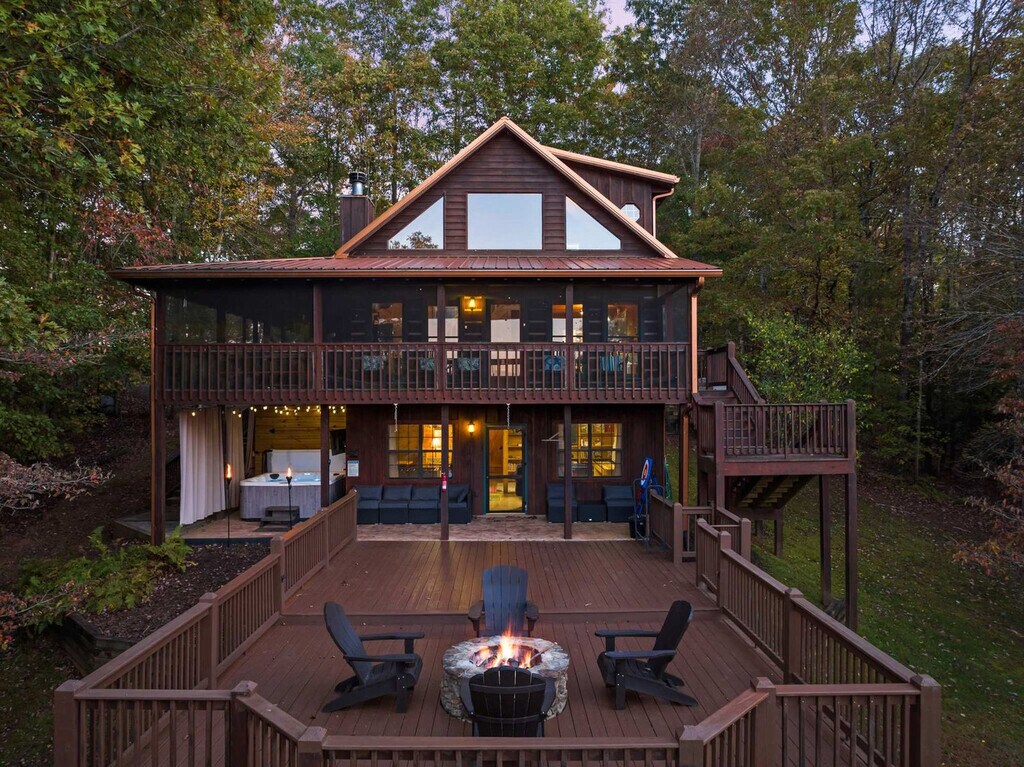 Feel at home in this 3-bedroom cabin in Mineral Bluff, GA, offering stunning views of the Blue Ridge Mountains. This spacious retreat comfortably sleeps up to 8 guests. This cabin features an open-concept, two-story living area with a soaring vaulted ceiling, a stone-hearth on-demand gas fireplace, and a fully stocked chef’s kitchen with high-end stainless appliances, a large refrigerator, ample cabinetry and cooking space, and a coffee maker (Keurig and drip). Enjoy the game room with shuffleboard, foosball, video, board and card games, and a lounging area with a smart TV. There are also two expansive decks, including a screened-in upper porch and an extra-large lower deck with a hot tub, fire pit, corn hole, an outdoor patio/dining area, and a BBQ grill. Parking is available for 3 vehicles in the driveway. Street parking is not allowed. Conveniently located near McCaysville, Blue Ridge, and the Toccoa River, you’ll have easy access to local dining, shopping, and outdoor adventures. Nearby attractions include Horseshoe Bend Park (1.5 miles), Tooney's Music Venue (3 miles), Buck Bald Brewing (3 miles), Toccoa River Tubing Company (3 miles), Mineral Bluff Depot & Motor Car Rides (3 miles), Appalachian Trail Rides (4 miles), Old Toccoa Farm Golf Course (6 miles), Mercier Orchards (Blue Ridge) (9 miles), Blue Ridge Scenic Railway (10 miles), Downtown McCaysville (3 miles), and Downtown Blue Ridge (10 miles). No pets are allowed. No parties are allowed—violations may result in immediate termination of the stay. An exterior camera is installed solely to monitor the cleaning team for quality and security purposes. Check-in is at 4pm and check-out is at 10am. Guests must be 21 years or older to book this property. Includes a dedicated workspace in the loft area. [SI]