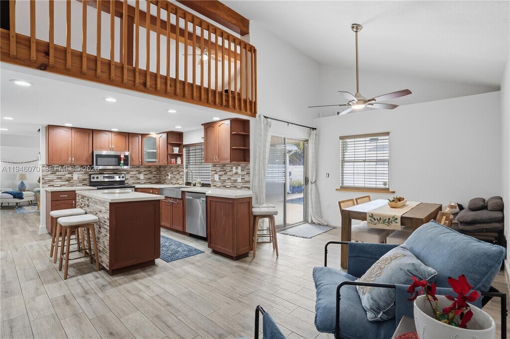 House for rent in Country Walk. 3 bedrooms 2 baths, a 1-car garage, a separate laundry room, and a generous upstairs loft. Step into a bright, open living space with soaring vaulted ceilings and a stunning fireplace that anchors the room. A dramatic spiral staircase leads to the oversized loft, ideal for a game room, home office, or second living area. Quartz countertops,stainless steel appliances, ample cabinetry, and a largeisland perfect for everyday living and entertaining. The monthly rent covers pool maintance. MLS # A11946070