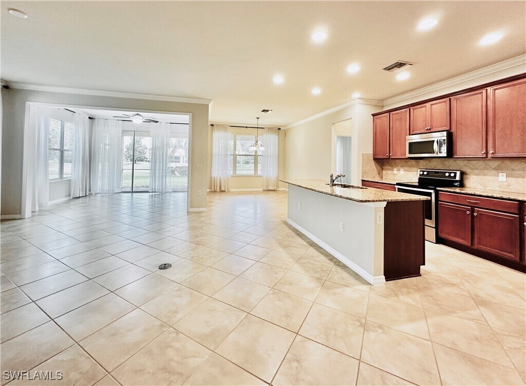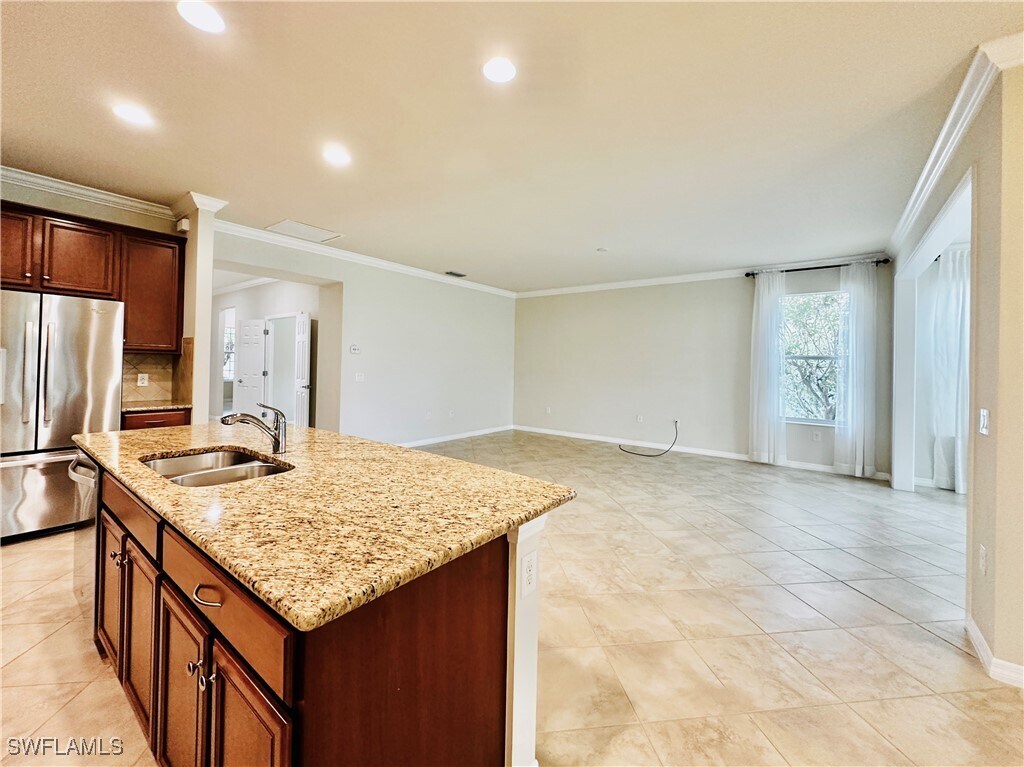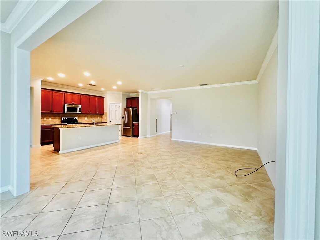 REDUCED! Lakefront 2,168 sq ft 3 bedroom plus a den,in sought after Village Walk; luxury and convenience at every turn! This well maintained split floor plan features a separate living,dining,Florida room and master bedroom that all offer peaceful lake views! Enjoy added elbow room from the private den / office (or 4th guest bedroom),under air laundry room,a two car garage and the oversized screened lanai. The kitchen boasts ample cabinet space,a quality stainless appliance package,a sizable pantry,a breakfast bar for entertaining and quartz countertops. In the master bath,you will find quality cabinetry,dual sinks,an oversized walk-in closet,all tile shower and extra floor space for a vanity or laundry station. The details include 18 inch diagonal tile flooring,crown molding and quality rods and curtains. This home is move-in ready and truly a rare find. Located in Village Walk,a resort-style gated community offering a plethora of amenities and convenience close to home. The Lake front Town Center offers a gas station,car wash,restaurants,a spa,salon,24/7 world class fitness center,a stunning resort style pool and separate lap pool,8 lighted tennis courts,3 pickleball courts,bocce ball,basketball,playground,a library,club house and more. Situated just minutes from Bonita Beach,great dining,RSW Airport and the new Midtown at Bonita.