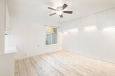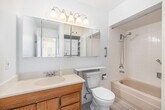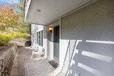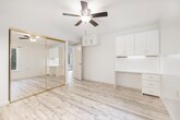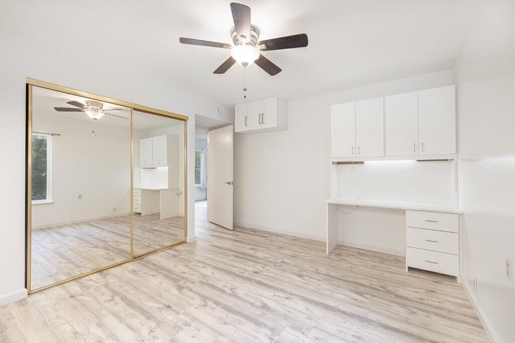 Warm flooring and an open layout define the living area of this Walnut Creek home in a 55+ community, offering a generous canvas for furniture placement, artwork, and everyday movement. Cabinetry runs along the upper wall, providing intentional storage without intruding on the rooms calm sense of space. A ceiling fan centers the room, and sliding glass doors bring in garden greenery, creating a quiet conversation between indoors and outdoors. Just beyond, the kitchen presents itself as compact and orderly. Cabinetry keeps essentials organized, while a movable island stands ready for preparing meals, setting out morning coffee, or working through an afternoon project. Light filters in through multiple windows, shifting gently throughout the day. In the bedroom, built-in storage and a desk create a natural workspace or reading corner. The window opens to surrounding plant life. Your bathroom includes a full tub with supportive handrails. This 55+ community is designed for balance. Enjoy a gym, tennis court, pool, hot tub, grill area, mailroom, package room, laundry room, and a charging station. Everyday necessities are close by, including Safeway, Whole Foods, Broadway Plaza, Heather Farm Park, and local cafés along Ygnacio Valley Road. One pet cat allowed