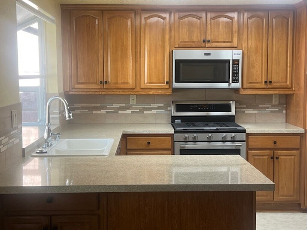 This cozy Sylmar home is ready for move-in. Upon entering, you will find an open-concept living and dining area featuring plantation shutters and a decorative fireplace. The kitchen is equipped with beautiful granite countertops, a bay window, ample cupboard space, and a full suite of appliances including a refrigerator, dishwasher, range, and microwave. Adjacent to the kitchen is a family room featuring a built-in media center with extensive cabinetry. The hallway provides additional storage for linens, leading to three well-sized bedrooms. The extra-spacious primary suite includes a large closet and a vanity sink separate from the shower area. Additional features include: - Direct interior access to an oversized garage with a washer/dryer and a workbench. - A beautifully landscaped, fenced backyard with mature fruit trees, a covered patio with privacy shades, a storage shed, and alley access. - Newer carpeting, unique window treatments, and central heating and air. The home is conveniently located near shopping and restaurants. To schedule a viewing, please contact me at (cell/text) or via email at .