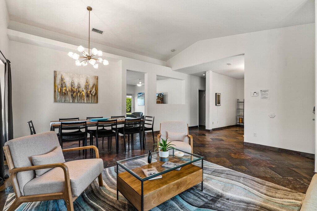 Mountain Views that greet you and wrap around to the Backyard. Enter into a stylish Living/Dining room combination,warmed by a cozy fireplace. The highly upgraded Chef's Kitchen provides loads of storage,contemporary appliances,custom lighting and Center Island / Breakfast Bar; Open to the adjoining Family Room! THE PLACE to gather,share and create memories! Dual French Doors provide easy access to the lush back patio with covered conversation area,and a Veranda perfect for Al Fresco style dining! Find tranquility and relaxation here,as everyone engages around the firepit! Celebrate Sunkissed Splendor enjoying your oversized pebble tech pool and spa. Boasting 3 Guest Bedrooms,one currently used as a den. The guest bath is centrally located to each bedroom. The generous Primary Suite offers direct access to the backyard,huge walk in closet and bathroom with dual sinks,shower. tub and water closet. Improvements you can count on include OWNED SOLAR,Custom window treatments and TURNKEY FURNISHED or UNFURNISHED! The nicely sized garage offers direct home access through the Laundry Room for easy living. Close to shopping,dining,entertainment and beyond!! This is Pizzazz in PALM SPRINGS!
