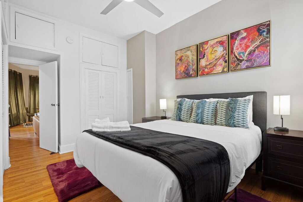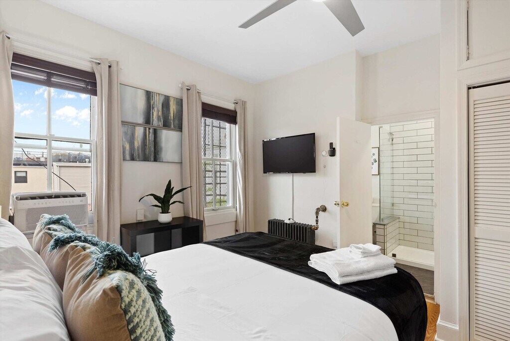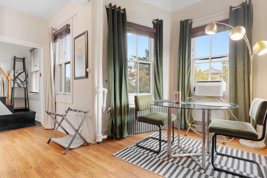 Feel at home in this inviting 1-bedroom apartment with a loft space, located just steps from the historic Logan Circle, 14th Street nightlife, and Dupont Circle Metro station. Situated in a quaint 4-unit large DC townhome, this apartment offers a central location that puts you close to all the fun, excitement, and history found in the city, while providing plenty of space for relaxation. The apartment features a fully stocked kitchen, an onsite washer and dryer, and smart TVs in both the bedroom and living room. Unwind in the lovely full bathroom with a spacious stall shower that's kept clean and sanitized. Flexible check-in and check-out are available upon request. Dupont Circle is the grand hub of D.C., known for its vibrant urban and cultural life. The area is home to museums, art galleries, embassies, offbeat shops, specialty bookstores, coffeehouses, and varied restaurants. The Logan Circle neighborhood, running to the east along P Street and stretching north along the 14th Street Corridor, offers sidewalk cafés, theaters, and a lively nightlife. Public transportation options include bus stops and the Red Line Metro at Dupont Circle Station. The loft ceiling is sloped, with a height ranging from 3ft 6in to 5ft 8in. Guests are encouraged to be courteous to neighbors by keeping noise levels reasonable, especially during quiet hours from 10 PM to 8 AM. Only toilet paper should be flushed to avoid potential repair costs. Smoking or vaping of any kind is prohibited inside the apartment and building, and no parties or events are allowed. For your convenience, high-speed Wi-Fi is available free-of-charge, allowing you to connect with friends and family or keep up with work emails. Registration Number: 500724 [SI]