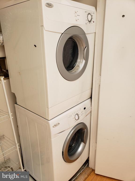 Stairway to heaven! Private entrance to beautiful two bedroom, two bath unit. first floor features open plan with gleaming wood floors and lots of light. Updated kitchen opens to large balcony. Second floor has two bedrooms, one en-suite bath, and a second hall bath. the second bedroom has a small second balcony. Skylights provide great light throughout. Washer/dryer is also located conveniently on the second floor. All this in a fantastic location (walk score of 96) and with a dedicated parking space included. Tenant pays all utilities (electric).