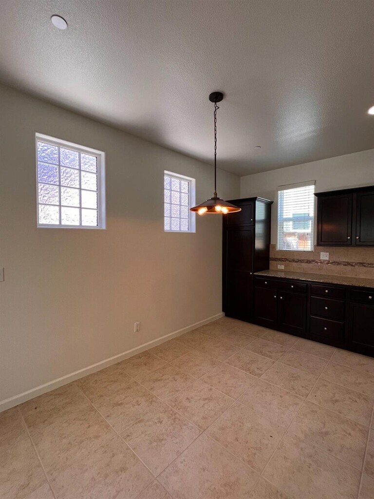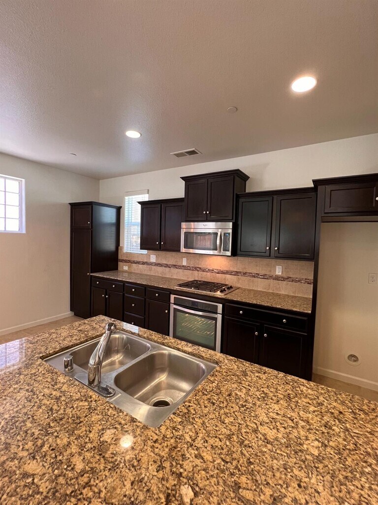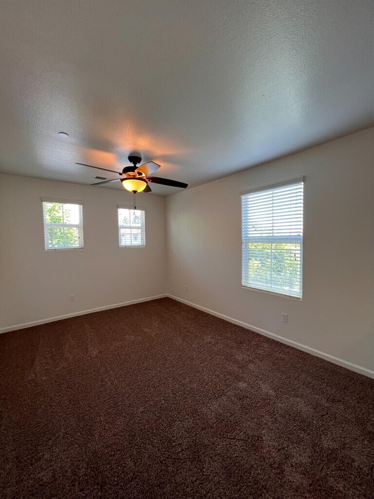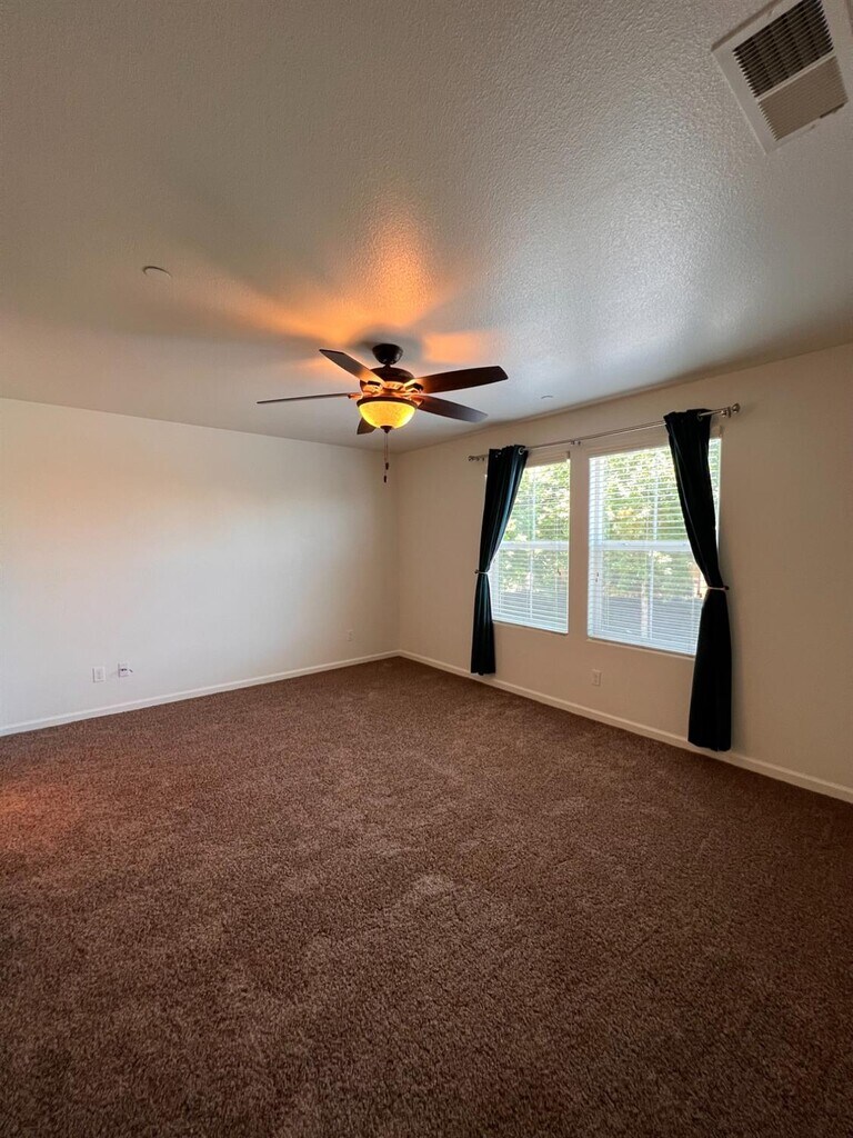 Beautiful 3 bedroom + loft, 2.5 bathroom Harlan Ranch home! This two story home offers 1,600 sq. ft. of living space, an attached 2-car garage, and quaint patio. The entry opens to a cozy living room and staircase. Updated kitchen featuring granite counter tops, stainless steel appliances, custom back splash, gas stove top and beautiful dark brown cabinets. Separate counter with sink with perfect set up for bar stool seating. Convenient 1/2 bathroom located downstairs. All bedrooms are upstairs including a loft and two full bathrooms with double sinks. Indoor laundry room located upstairs. Ceiling fans in all bedrooms. Darling patio with ample concrete space and low-maintenance landscaping. Renters insurance required. Available now!