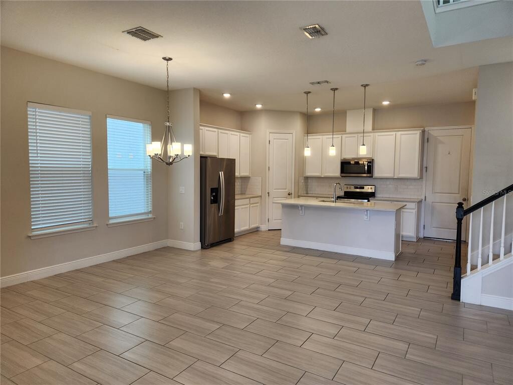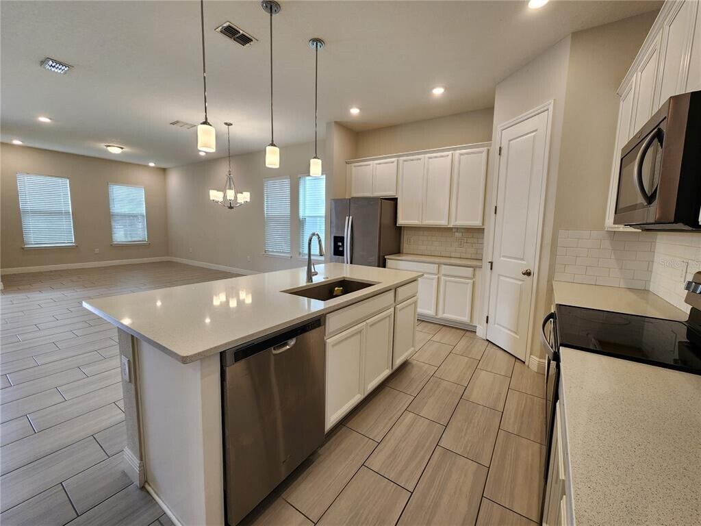Amazing 4 bedroom 2.5 bathroom home in highly desirable Watermark community off the 429 near Avalon and Seidel rd. Built in 2020 with 2204 sf,this home offers an open floor plan with great style,architecture,and tasteful decor. The open-concept with kitchen,dining,living room,and cute side cubby combined is great for entertaining. Spacious living areas,contemporary fixtures,and vinyl flooring throughout the first floor. The open kitchen is well designed and very pleasing to view with white upgraded cabinets,crown molding,accented with all stainless-steel appliances,quartz countertops,tiled backsplash,breakfast bar with drop lights on the island,and a walk-in pantry. Stairs are accented with beautiful open rail. Second floor has a nice size loft,and enter into the large primary bedroom with double doors with huge primary bath. Two separated large vanities,large walk-in shower with custom tile and set backs,large closet,linen closet and toilet room. The washer and dryer have a large laundry room and the other bedrooms share the hall bath with large counter and dual sinks. The back driveway has pavers up to the house and the front of the house looks over a huge,dry retention field. The neighborhood has two community pools,a deluxe resort-style pool and splash pad equipped with cabanas,a nearby gym,and a cool Fire pit overlooking a small pond lined up for viewing of the Disney fireworks! Located perfectly near the heart of Hamlin off Seidel Rd and 429 with convenience just minutes away from brand-new restaurants,shopping,healthcare facilities. MLS# O6359584
