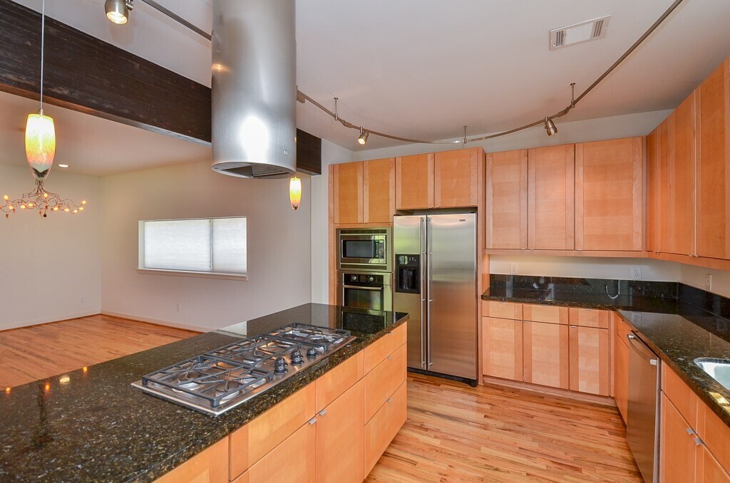 Contemporary end unit townhome just blocks to newly redesigned Memorial Park,Washington Ave & convenient to I-10 & 610 Loop! Warm modern finishes,concrete & wood floors (NO CARPET),planked slate gas log fireplace,exposed stained trusses & beams,high ceilings,open living spaces,wood floors,kitchen w/granite counters,SS appliances,refrigerator,gas cooktop & vent hood,primary suite w/custom cabinetry in dressing area,walk-in closet,slate & mosaic baths throughout,tub & open shower,custom metal & wood stairs,landing w/wood floors on 4th level,Roof deck. MLS# 10661075