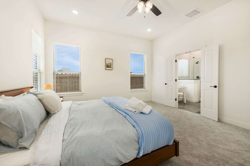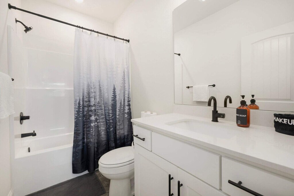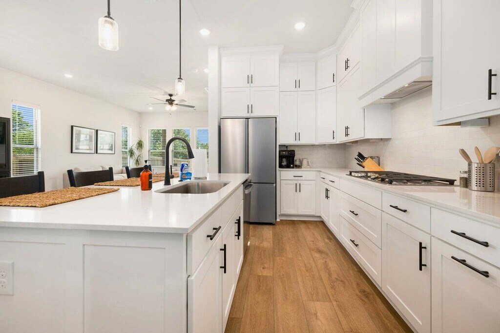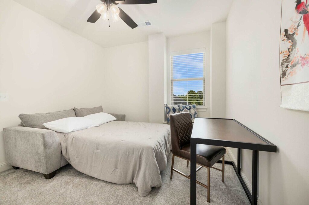 Welcome to Zen Spot, a newly built modern home centrally located to explore all of Northwest Arkansas. Just 4 miles from The Amp and The Promenade and 2 miles from mini golf, arcades, and a trampoline park, this home offers two living areas and a peaceful backyard for relaxation. With two private office spaces, it's perfect for work and leisure. This home features a cozy, fully fenced backyard with a grill and table, and a second living area upstairs with a projector. The fully stocked kitchen boasts high-end amenities, cookware, and supplies, complemented by a modern and open living room with a Smart TV and a cozy couch. A washer and dryer are available for guest use. Centrally located with easy interstate access, the home is in a brand-new neighborhood. Just a block away from stores and restaurants, and close to highway access, you can easily reach Bentonville, Bella Vista, or Fayetteville. Explore several nearby breweries and enjoy proximity to Pinnacle Hills Promenade and world-class golf courses at Pinnacle Country Club and Shadow Valley Country Club. Check-in is any time after 3:00 PM. Parties or guest actions that result in disturbances, property damage, extensive extra cleaning, or smoking indoors will incur a fine of $1,000. This property is not pet-friendly, and pets discovered at the property will incur a fine of $400. Unauthorized checkout delays will incur a fine of $100 per hour. This is a non-smoking home, and smoking indoors will result in a $1,000 fine plus the cost of any smoke remediation necessary. Quiet hours are between 10:00 PM and 10:00 AM. Includes two private office spaces with a desk and chair, perfect for remote work. [SI]