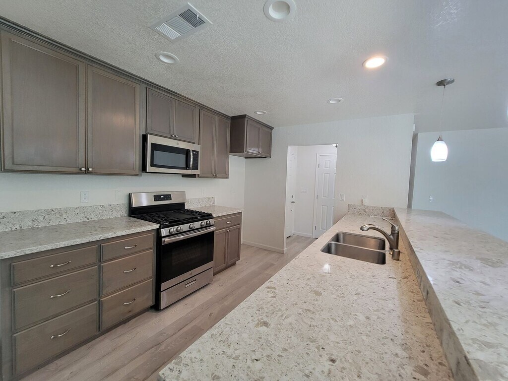 Welcome to this beautiful home in Southwest Visalia. This delightful property boasts three spacious bedrooms and two full bathrooms, offering ample space for comfort and relaxation. The home is located conveniently off of Walnut and Akers, placing you in a vibrant neighborhood with easy access to local amenities. The interior features hard surface flooring, adding a touch of elegance and ease of maintenance. The kitchen is a chef's dream, equipped with stainless steel appliances and a large breakfast bar, perfect for casual dining or entertaining guests. The home also offers a gas fireplace, creating a cozy atmosphere during cooler evenings. Step outside to a covered patio, an ideal spot for outdoor relaxation or hosting gatherings. With plenty of storage throughout, this home effortlessly caters to your organizational needs. Experience the perfect blend of comfort and convenience at the Beautiful Home Southwest Visalia.